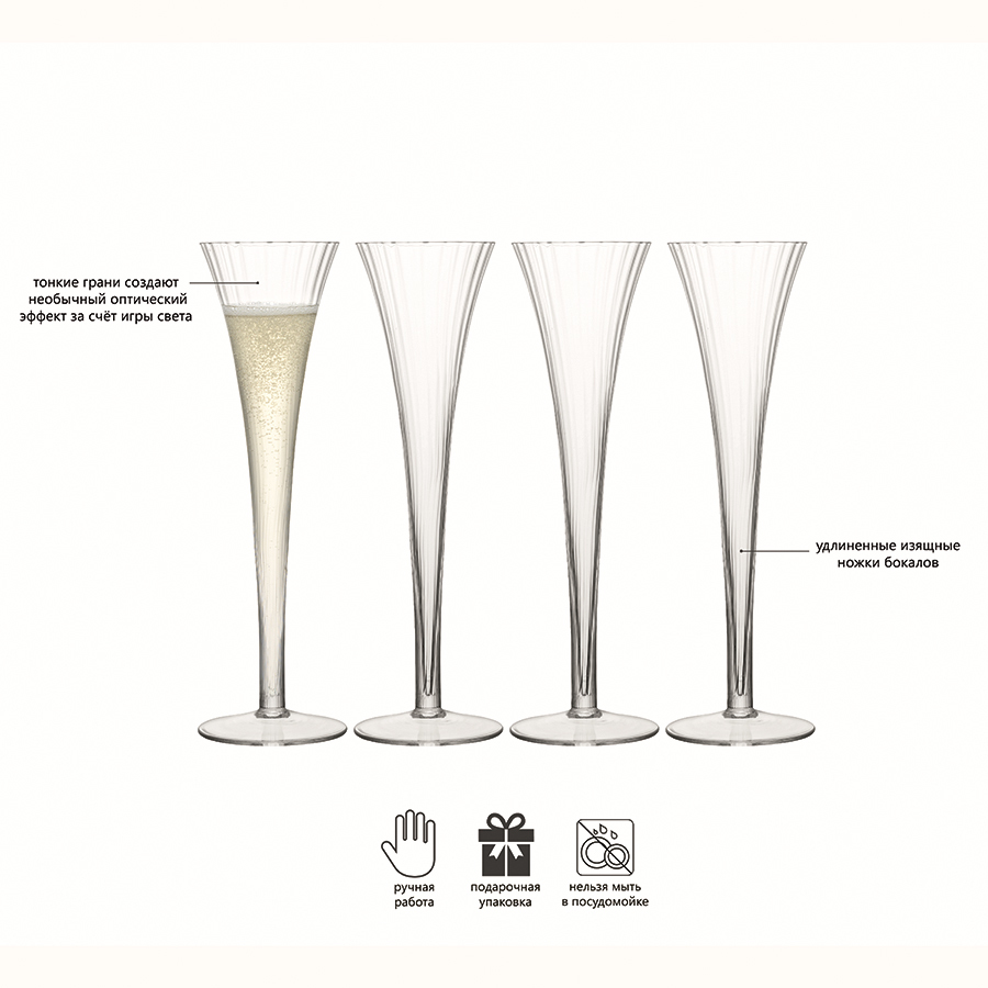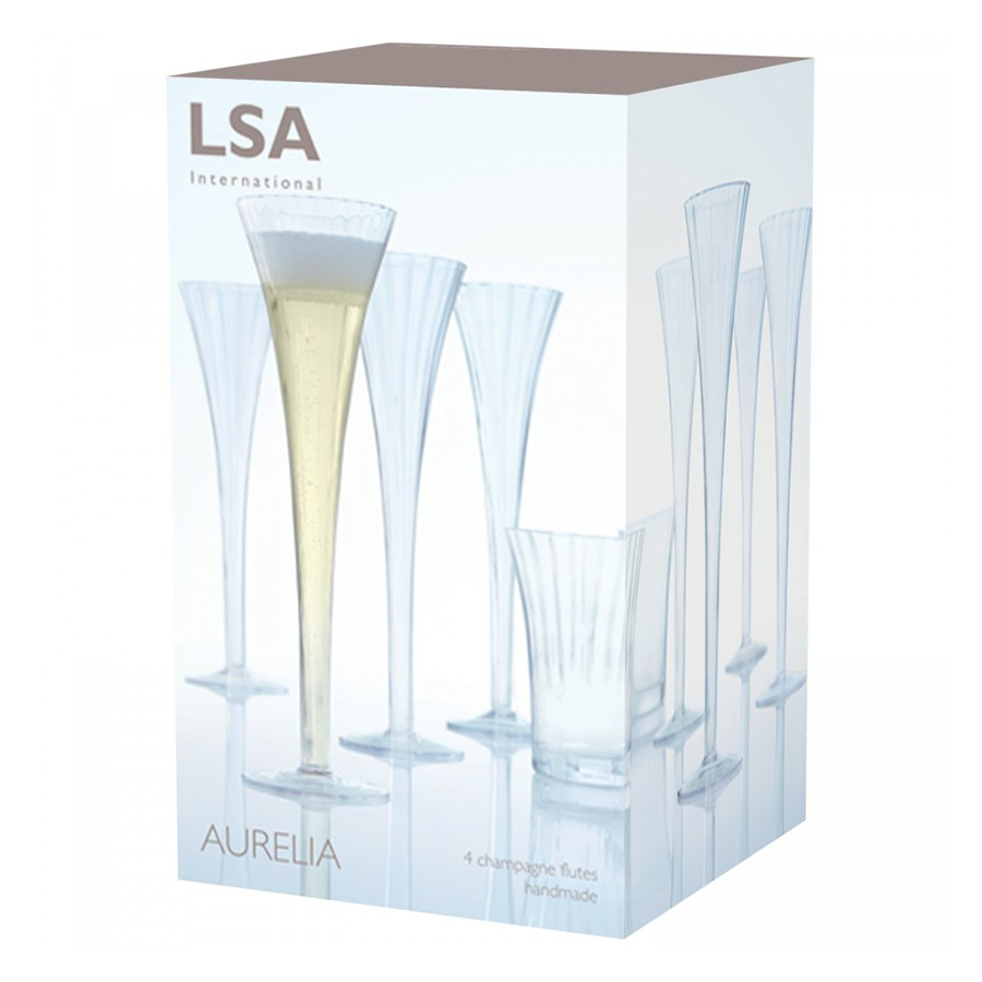 Добавьте изысканности вашей сервировке с бокалами-флейтами для шампанского Aurelia. Комбинируйте их с бокалами для белого и красного вина, и стаканами для воды, чтобы создать завершенную композицию. Бокалы упакованы в стильную коробку, поэтому станут отличным подарком. Набор состоит из 4-х бокалов. Объем каждого бокала 200 мл. Предметы коллекции Aurelia выполнены из прозрачного выдувного стекла. Особенности коллекции — тонкие грани, создающие необычный оптический эффект за счет игры света, и удлиненные тонкие ножки бокалов. Изысканная и утонченная Aurelia — идеальный выбор для торжественных и официальных мероприятий. Изделия рекомендуется мыть вручную в тёплой мыльной воде и вытирать насухо мягкой тканью. Мелкие пузырьки внутри выдувного стекла не являются браком (круглые пузырьки < 3 мм и овальные пузырьки < 5 мм): это допустимые индивидуальные особенности изделий, изготовленных вручную.