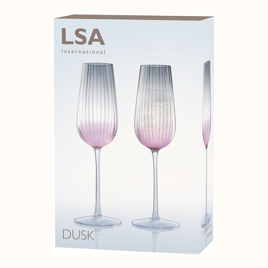 Набор из 2 бокалов-флейт Dusk предназначен для сервировки шампанского и других игристых вин, а также коктейлей на их основе. При оформлении посуды дизайнеры используют нежные цвета, которые в сочетании с плиссированной текстурой стекла создают переливающийся эффект. Такое решение выгодно подчеркивает содержимое бокалов и добавляет торжественные нотки сервировке стола. Набор упакован в красивую коробку и станет отличным подарком на юбилей и любой другой праздник. Бокалы гармонично сочетаются с другой посудой коллекции Dusk. Изделия рекомендуется мыть вручную в тёплой мыльной воде и вытирать насухо мягкой тканью. Мелкие пузырьки внутри выдувного стекла не являются браком (круглые пузырьки < 3 мм и овальные пузырьки < 5 мм): это допустимые индивидуальные особенности изделий, изготовленных вручную.