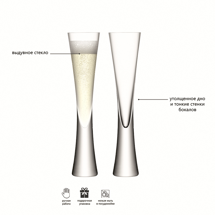 Набор из 2 бокалов-флейт для шампанского и других игристых вин, а также коктейлей на их основе. Объем 170 мл. Комбинируйте набор с другими предметами коллекции Moya для создания законченной композиции. Он упакован в красивую коробку и станет роскошным подарком для всех любителей праздников. Moya — коллекция барного стекла и элементов декора из выдувного стекла с тонкими стенками и утолщенным дном. Дизайнеры хотели создать совершенство форм и линий, которое напоминало бы о столпах яркого света. Добавьте щепотку декандентского шика в торжественную сервировку. Над линией работали лучшие мастера бренда LSA International. Изделия рекомендуется мыть вручную в тёплой мыльной воде и вытирать насухо мягкой тканью. Мелкие пузырьки внутри выдувного стекла не являются браком (круглые пузырьки < 3 мм и овальные пузырьки < 5 мм): это допустимые индивидуальные особенности изделий, изготовленных вручную.