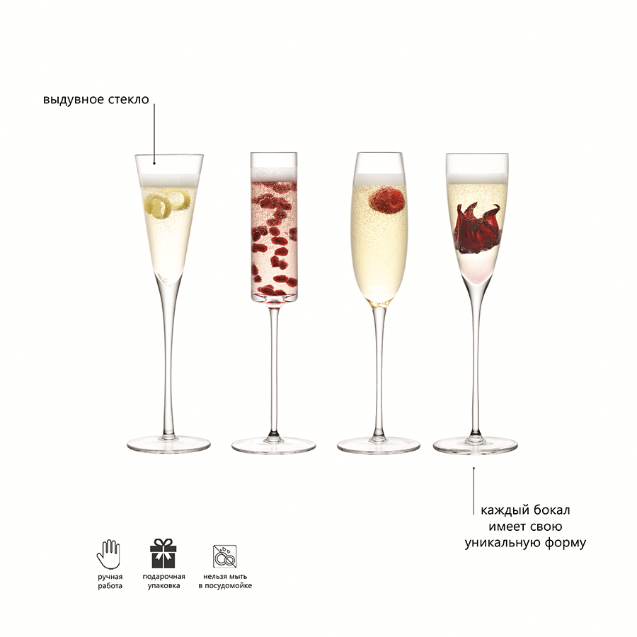 Набор из 4-х бокалов-флейт для шампанского, игристых вин и коктейлей из выдувного стекла. Объем 150-175 мл.Каждый бокал имеет свою уникальную форму — это добавит игривую нотку всей сервировке. Набор упакован в красивую коробку и станет отличным подарком всем поклонникам современного дизайна. Комбинируйте бокалы с другими предметами из коллекции Lulu, например, с рюмками, стаканами или пиалами для создания законченной композиции. Lulu — коллекция барного стекла, созданная лучшими мастерами-стекольщиками вручную. Разнообразие дизайнов, утонченные формы и чистые линии бокалов и пиал добавят изысканности сервировке любых напитков и закусок. В каждом наборе собраны элементы из самых популярных коллекций бренда. Изделия рекомендуется мыть вручную в тёплой мыльной воде и вытирать насухо мягкой тканью. Мелкие пузырьки внутри выдувного стекла не являются браком (круглые пузырьки < 3 мм и овальные пузырьки < 5 мм): это допустимые индивидуальные особенности изделий, изготовленных вручную.