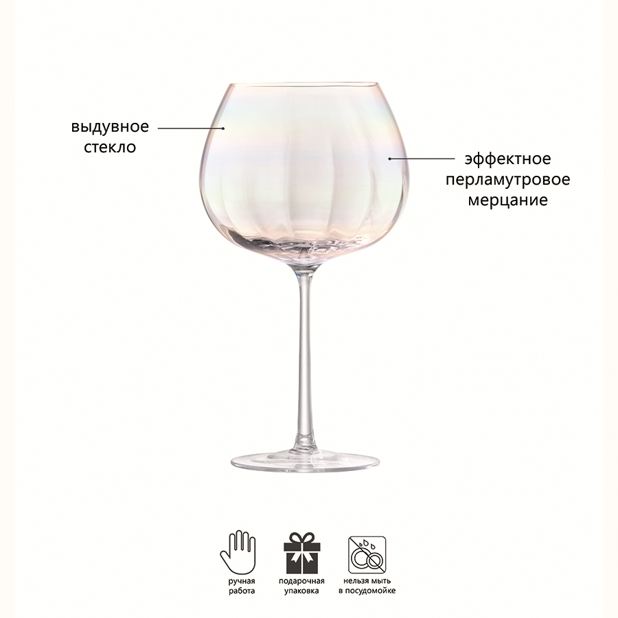 Бокалы для вина Pearl – эффектные и стильные изделия, изготовленные из стекла с жемчужным отливом. Посуда станет прекрасным дополнением к сервировке классического стола дома и в ресторане. Особенно эффектно будет смотреться с аксессуарами этой же серии. Материалы: выдувное стекло. Изделия рекомендуется мыть вручную в тёплой мыльной воде и вытирать насухо мягкой тканью. Мелкие пузырьки внутри выдувного стекла не являются браком (круглые пузырьки < 3 мм и овальные пузырьки < 5 мм): это допустимые индивидуальные особенности изделий, изготовленных вручную. Размеры: объем – 650 мл.