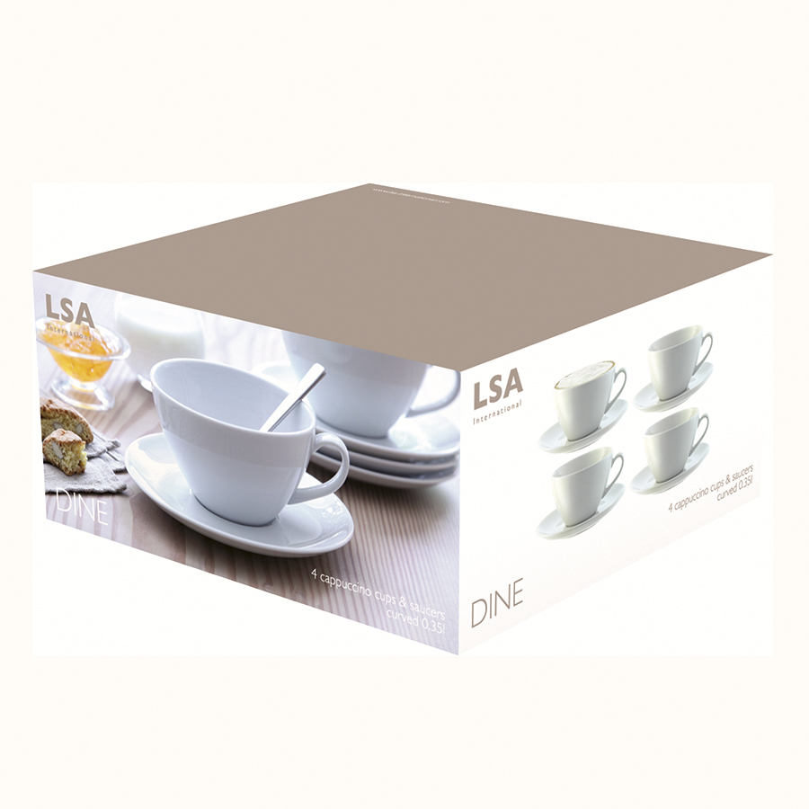 Набор из 4-х чашек с блюдцами для ароматного капучино с молочной пенкой и корицей. Чашки прекрасно подойдут как для ежедневного использования, так и для торжественных мероприятий. Объём 350мл. Набор упакован в красивую коробку и станет отличным подарком всем любителям кофе и чая. Комбинируйте их вместе с другими предметами из коллекции Dine для создания закоченной композиции. Dine — коллекция фарфоровой посуды, сочетающей в себе классику и современный дизайн. В линейке представлены тарелки, чашки, блюдца, миски, блюда, заварочные чайники, сахарницы, маслёнки, молочники и другие предметы для изысканной сервировки. Все элементы коллекции можно комбинировать между собой в зависимости от случая.