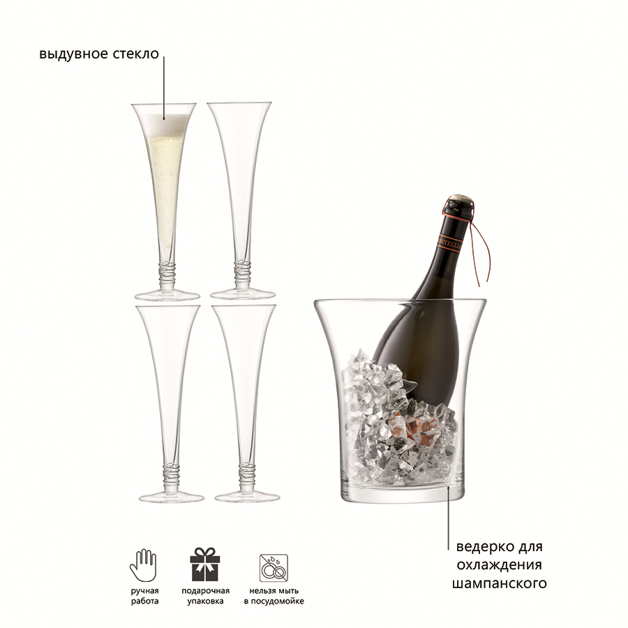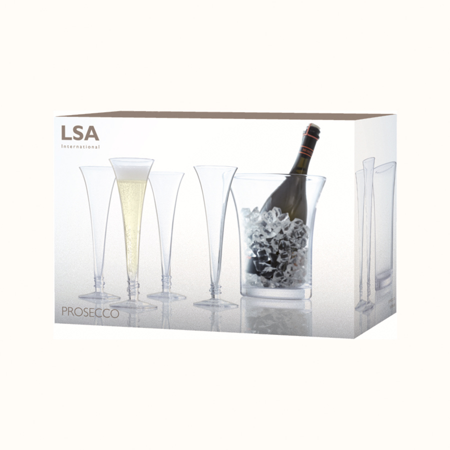 Набор из 4-х бокалов-флейт (140 мл) и ведерка для охлаждения шампанского или другого игристого вина. Набор выполнен из стекла ручной работы. Такой набор станет прекрасным дополнением к сервировке напитков во время коктейльной вечеринки или торжественных приемов. Комбинируйте набор с бокалами и аксессуарами из других коллекций бренда LSA International. Prosecco — коллекция бокалов и барных аксессуаров для игристых вин и коктейлей на их основе. Изящная форма и удлиненная ножка придает особой утонченности бокалам. Линия создана для коктейльных вечеринок и торжественных мероприятий. Изделия рекомендуется мыть вручную в тёплой мыльной воде и вытирать насухо мягкой тканью. Мелкие пузырьки внутри выдувного стекла не являются браком (круглые пузырьки < 3 мм и овальные пузырьки < 5 мм): это допустимые индивидуальные особенности изделий, изготовленных вручную.
