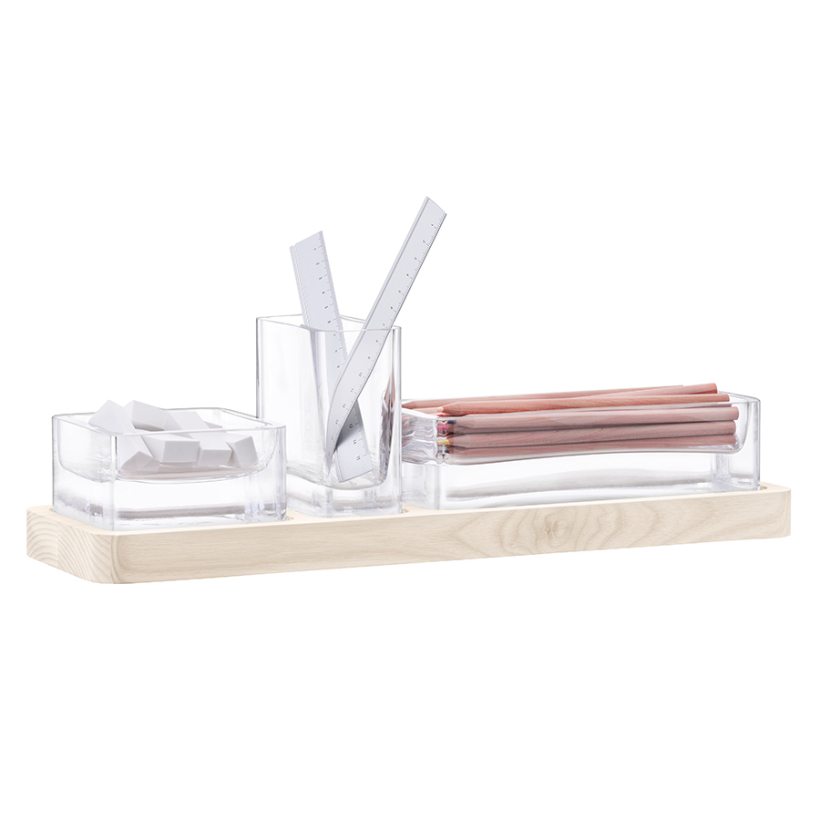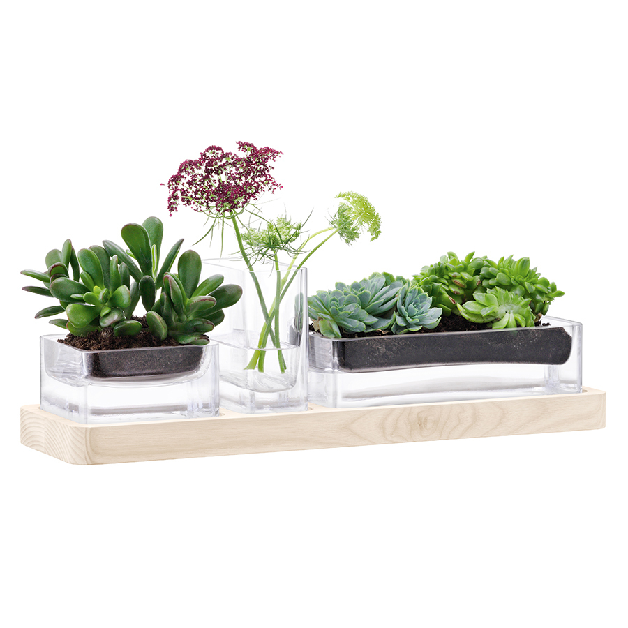 В набор входит 3 контейнера из выдувного стекла разной формы и подставки из натурального ясеня. Контейнеры можно использовать в качестве ваз для цветов, органайзеров для канцелярских принадлежностей или для хранения приятных мелочей. Можно также создать свой собственный мини-флорариум. Комбинируйте набор с вазами и другими предметами коллекции Modular. Modular — коллекция, вдохновленная совершенством геометрических и архитектурных форм. Чистые линии и выдувное стекло делает вазы из этой линейки уникальными произведениями современного дизайна. Вазы станут эффектным акцентом в интерьере и подчеркнут утончённый вкус хозяина(ки). Изделия рекомендуется мыть вручную в тёплой мыльной воде и вытирать насухо мягкой тканью. Мелкие пузырьки внутри выдувного стекла не являются браком (круглые пузырьки < 3 мм и овальные пузырьки < 5 мм): это допустимые индивидуальные особенности изделий, изготовленных вручную. Деревянные детали нужно протирать мягкой щеткой и влажной тканью, позволяя дереву высохнуть самостоятельно. Не погружайте их в воду и не мойте в посудомоечной машине.