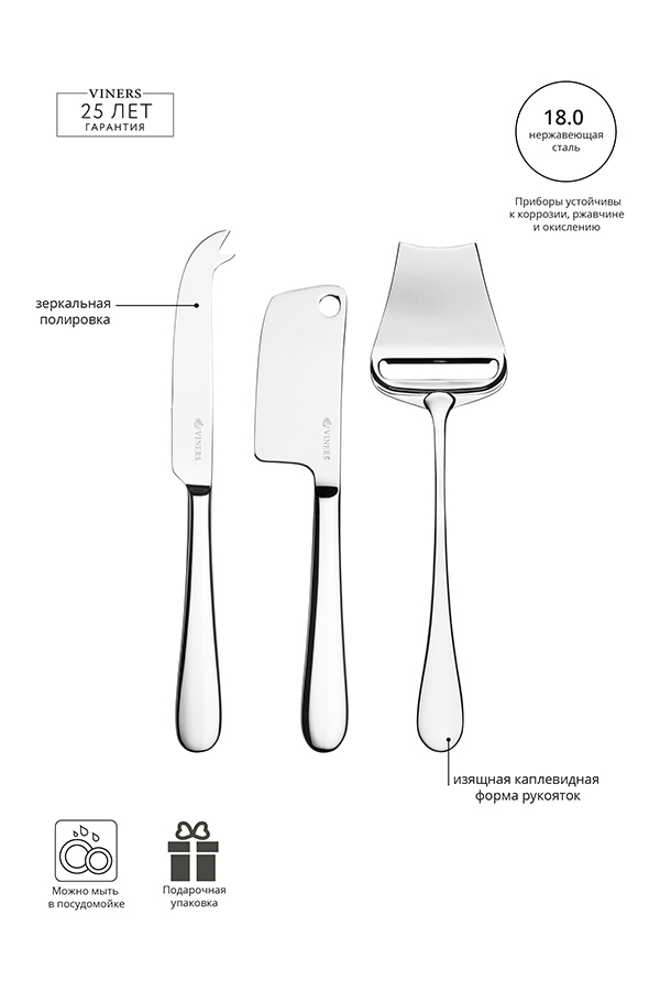 Набор для сервировки сыров и масла в подарочной упаковке. Можно мыть в посудомоечной машине. Набор станет отличным подарком на памятную дату. Select — коллекция столовых приборов из нержавеющей стали 18.0, которая производится по самым высоким стандартам качества. Приборы устойчивы к коррозии, ржавчине и окислению. Бренд Viners даёт гарантию на коллекцию 25 лет.