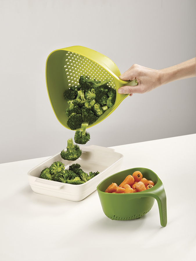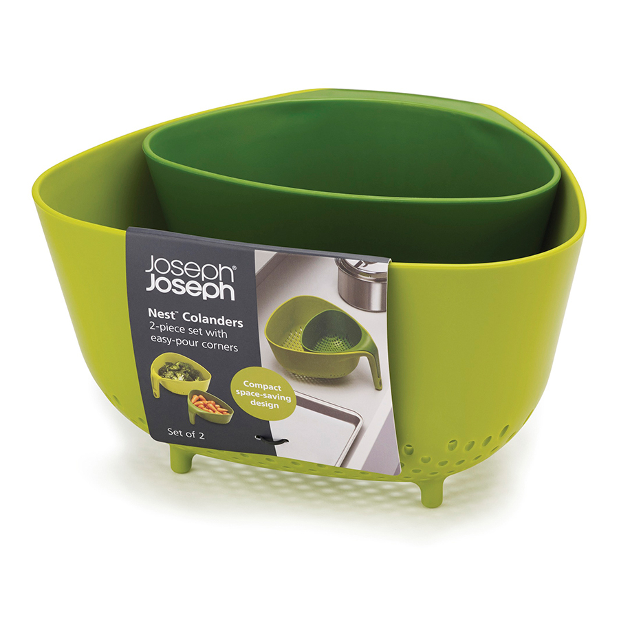 В комплект входят два дуршлага разных размеров, которые вставляются друг в друга для компактного хранения. Эргономичная вертикальная ручка обеспечивает устойчивость на ровных поверхностях (стол, раковина, полка). Дуршлаг удобно держать одной рукой. Изделия выполнены из пластика и идеально подходят для мытья ягод, фруктов, овощей и зелени. Материал не содержит бисфенола-А.