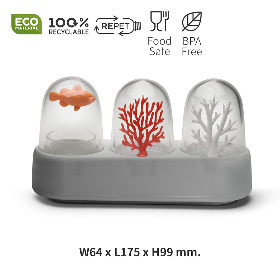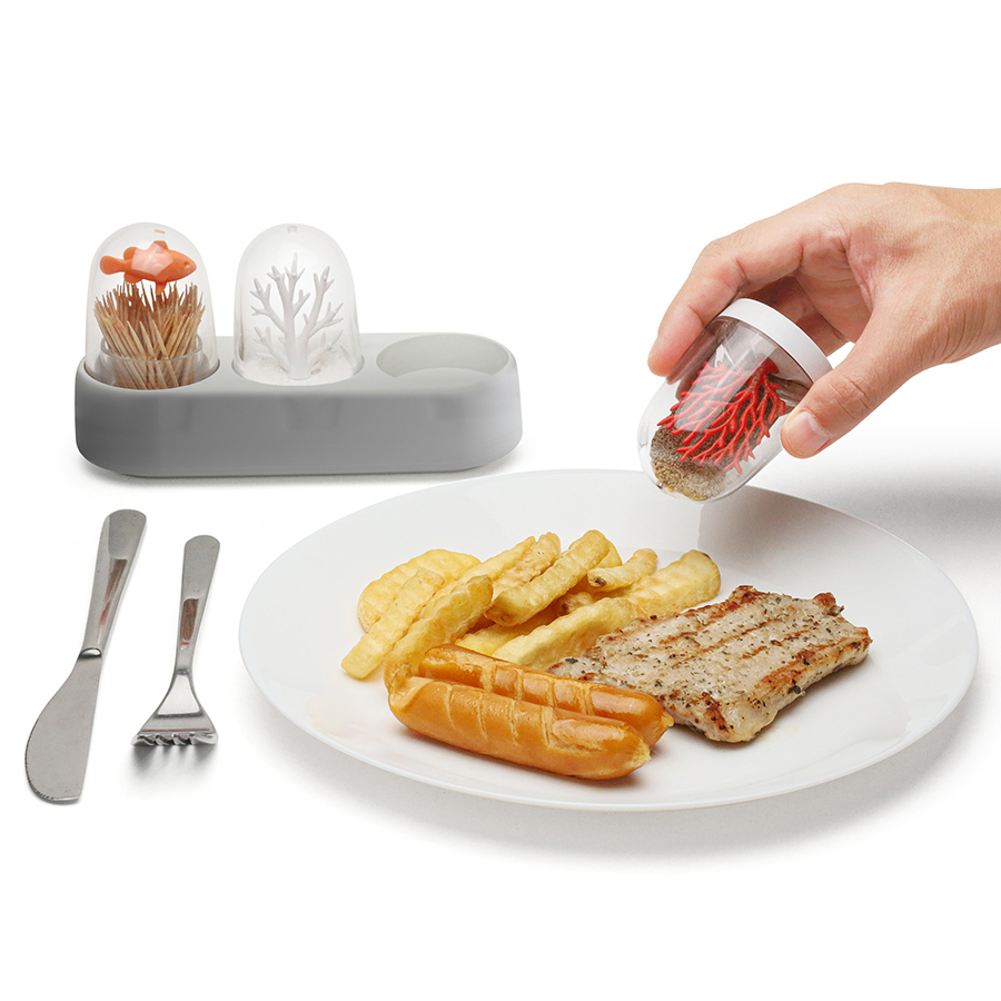 Оригинальный набор Ocean Ecology, состоящий из солонки, перечницы и емкости для зубочисток, станет настоящим украшением повседневного и праздничного стола. Наряду со своими прямыми функциями, изделия могут служить необычным декором за счет интересного дизайна с отсылкой к морской тематике. Эргономичная подставка обеспечивает компактное хранение. Предметы из комплекта выполнены из безопасных, практичных и устойчивых к износу материалов.