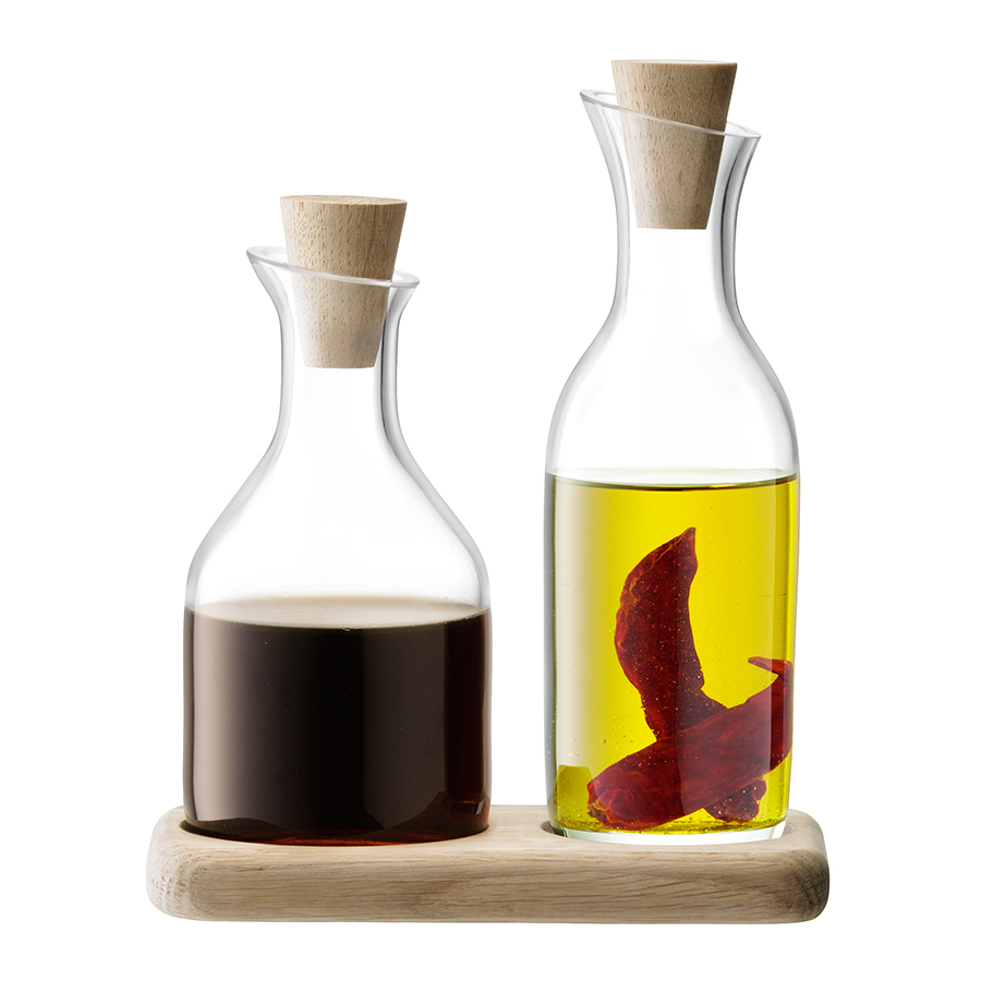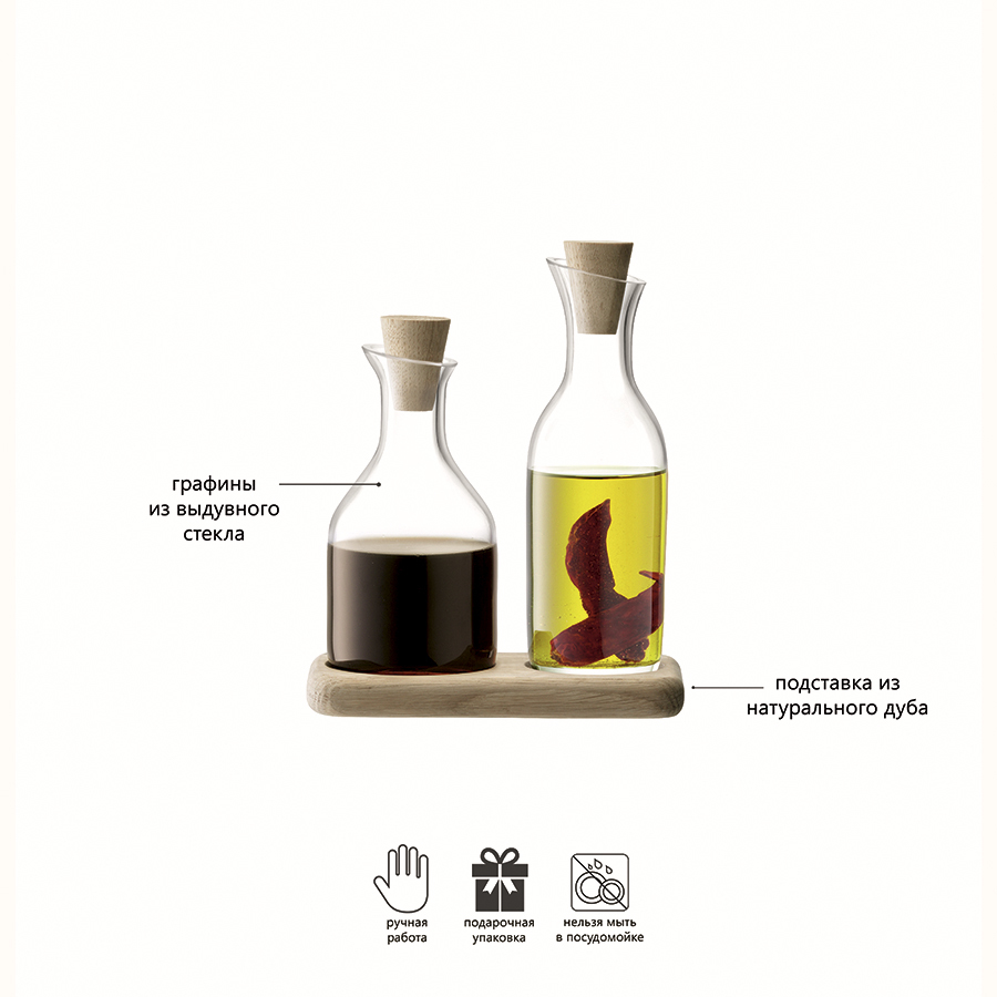 Элегантный набор из 2-х графинов из выдувного стекла и подставки из натурального дуба идеально подойдет для подачи растительного масла и уксуса. Он незаменим для сервировки салатов из свежих овощей, фокаччи, пиццы и других средиземноморских блюд. Набор упакован в красивую коробку и станет прекрасным подарком друзьям, коллегам, близким и всем, кто любит готовить.