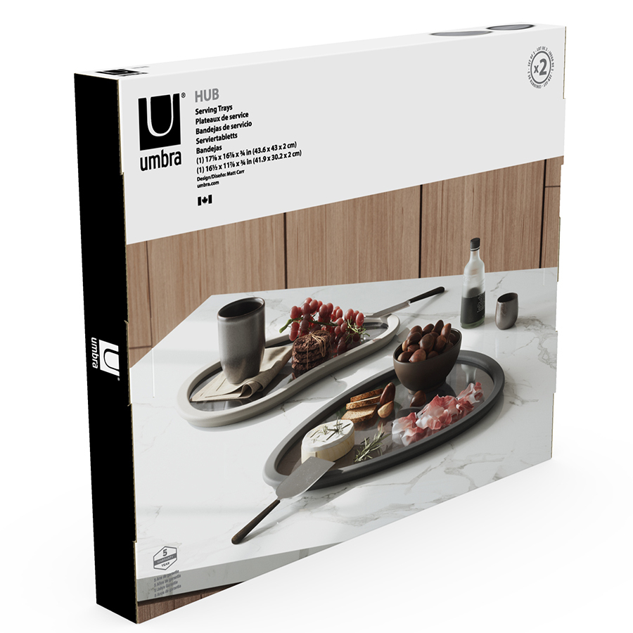 Подносы уникальной формы Hub помогут осуществить эффектную подачу блюд и станут украшением любой сервировки. Отделка из тонированного стекла делает дизайн интересным, а резиновый ободок обеспечивает изделиям дополнительную прочность и облегчает переноску посуды. Подносы также можно использовать в декоративных целях – размещать на них свечи, ароматизаторы для дома и любые другие предметы.
