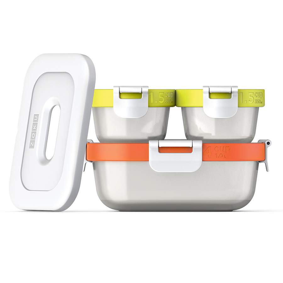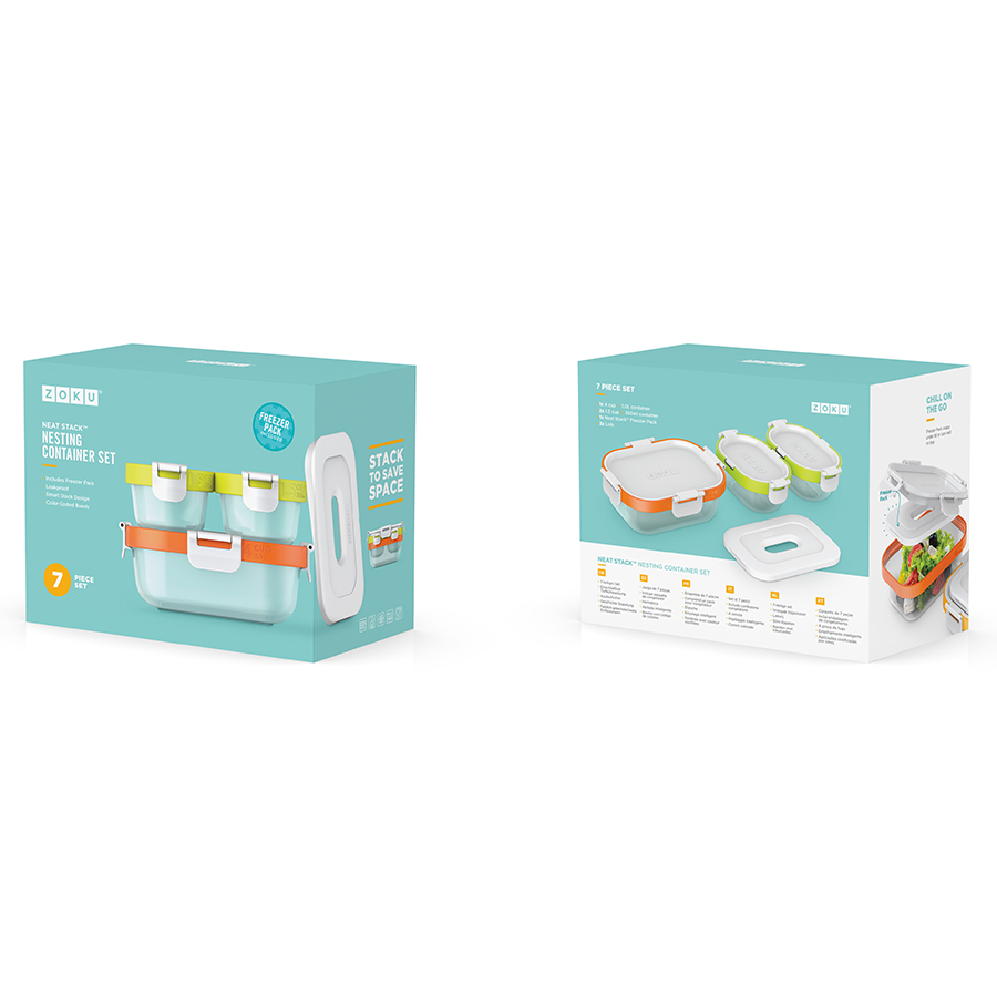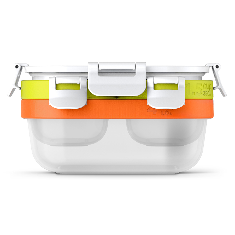 Водонепроницаемые запорные крышки обеспечивают полную герметичность продуктам. Каждый контейнер снабжен цветной полоской из силикона, которая поможет хозяйке быстро найти нужный размер. Охлаждающий блок поддерживает оптимальную температуру содержимого контейнера в течение длительного времени. Его можно разместить внутри или снаружи ёмкости. Контейнеры можно использовать в микроволновой печи и морозильной камере, а также мыть в посудомоечной машине.