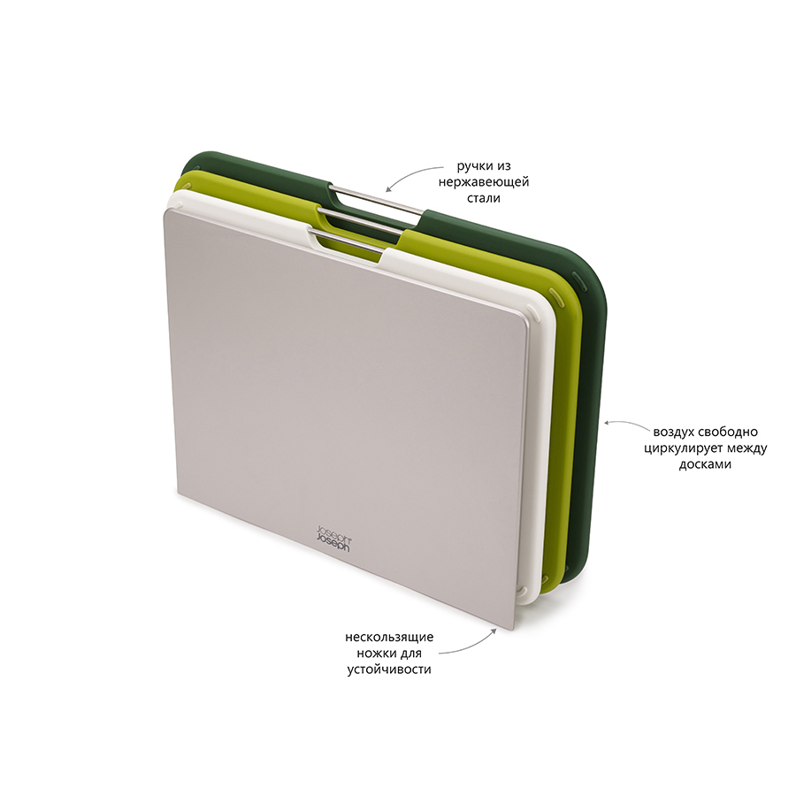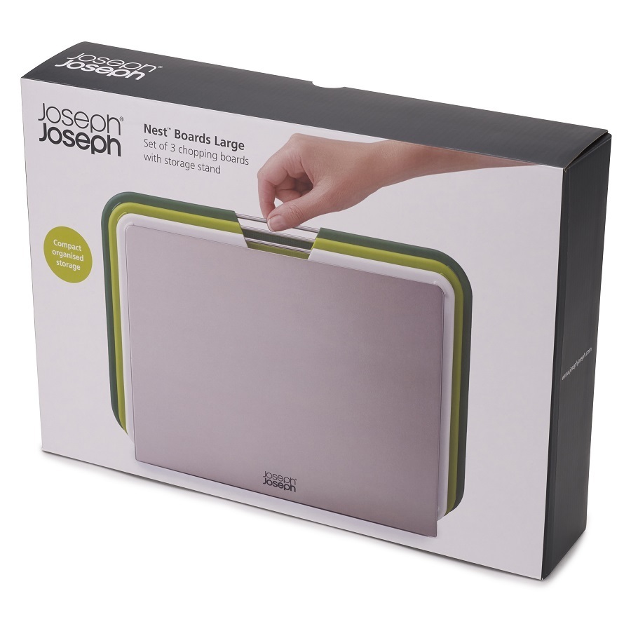 Набор из 3 разделочных досок Nest Large подходит для выполнения различных задач по приготовлению пищи. Специальная подставка удерживает аксессуары на расстоянии, позволяя воздуху равномерно циркулировать между ними. Чтобы облегчить нарезку продуктов, доска снабжена фактурной поверхностью. Резиновые ножки препятствуют скольжению изделия по кухонной столешнице. Эргономичная ручка в виде прутика из нержавеющей стали дает возможность легко брать доску во время готовки. Разделочные доски можно мыть в посудомоечной машине. Подставку рекомендуется протирать влажной тканью.