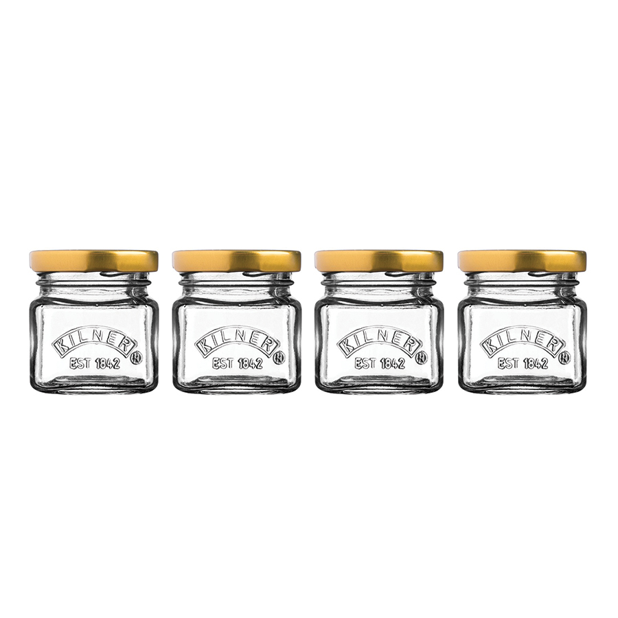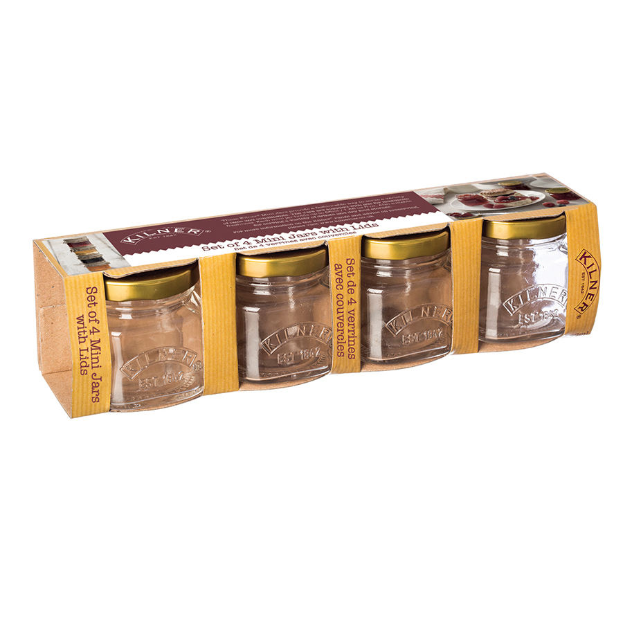 Набор из 4 стильных баночек, которые подходят для хранения джемов, карамели, мёда, специй и разных приятных мелочей. Удобная закручивающаяся крышка плотно прилегает к краям банки и не пропускает воздух. Это позволяет сохранять продукты свежими дольше, чем в пластиковых контейнерах. Банки украшены фирменным логотипом бренда Kilner. Набор упакован в красивую коробку и станет прекрасным подарком любой хозяйке. Особенности: - объём 55 мл - рекомендуется промыть перед первым использованием - в ёмкость не рекомендуется наливать кипяток