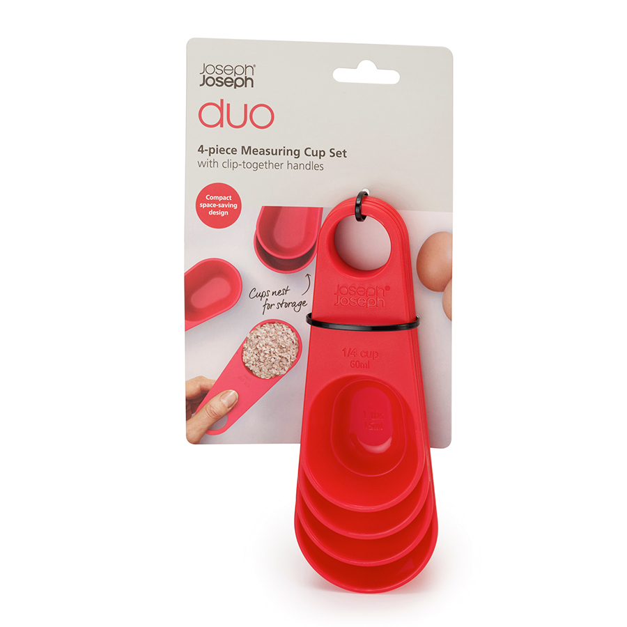 Набор ёмкостей для измерения сыпучих продуктов незаменим во время приготовления различных блюд, особенно выпечки. Особенности и преимущества: - объем: 1 чашка (250мл); 1/2 чашки (125мл); 1?3 чашки (85мл); 1?4 чашки (60мл) - ёмкости складываются друг в друга, ручки сцепляются вместе для удобного хранения - можно мыть в посудомоечной машине DUO — новая линейка стильных и эргономичных аксессуаров для кухни от Joseph Joseph. Дизайнеры бренда выявили основные проблемы, возникающие в процессе готовки, и создали уникальную коллекцию DUO для привлечения широкого круга покупателей. Они разработали облегчённый дизайн бестселлеров Joseph Joseph, которые соответствуют самым высоким показателям по практичности и функциональности. Все аксессуары выполнены из высококачественных и прочных материалов и станут фаворитами на любой кухне.