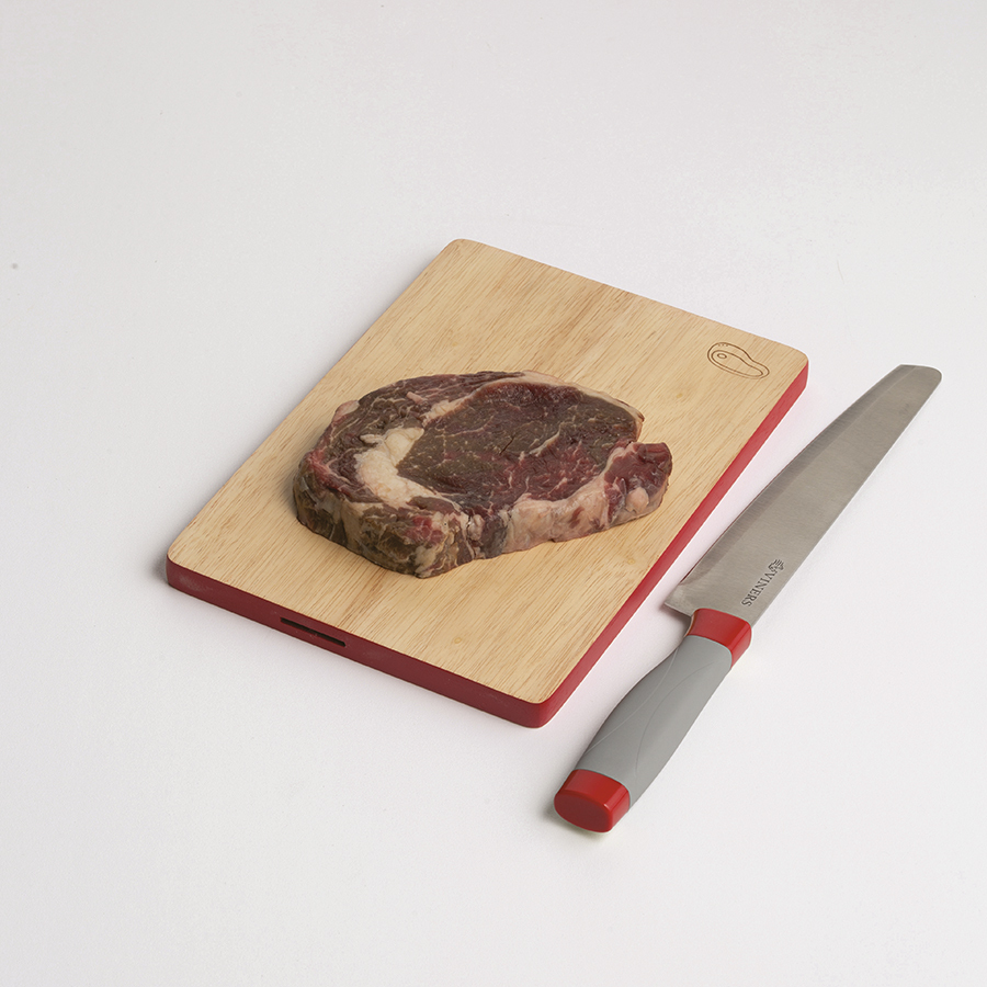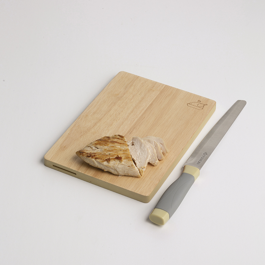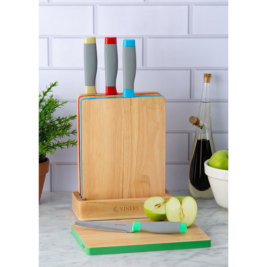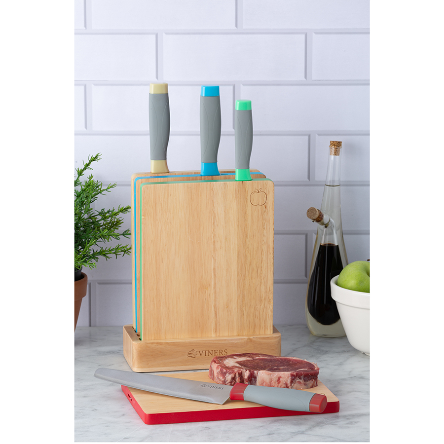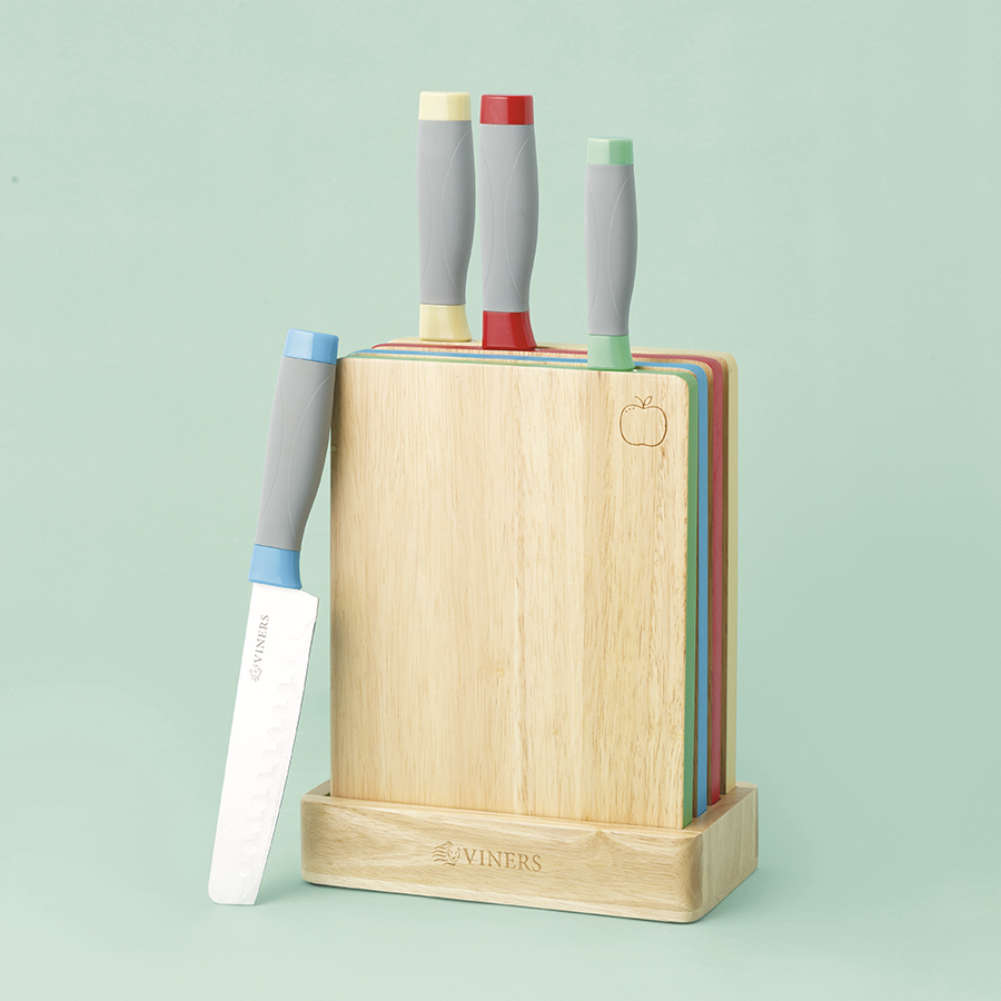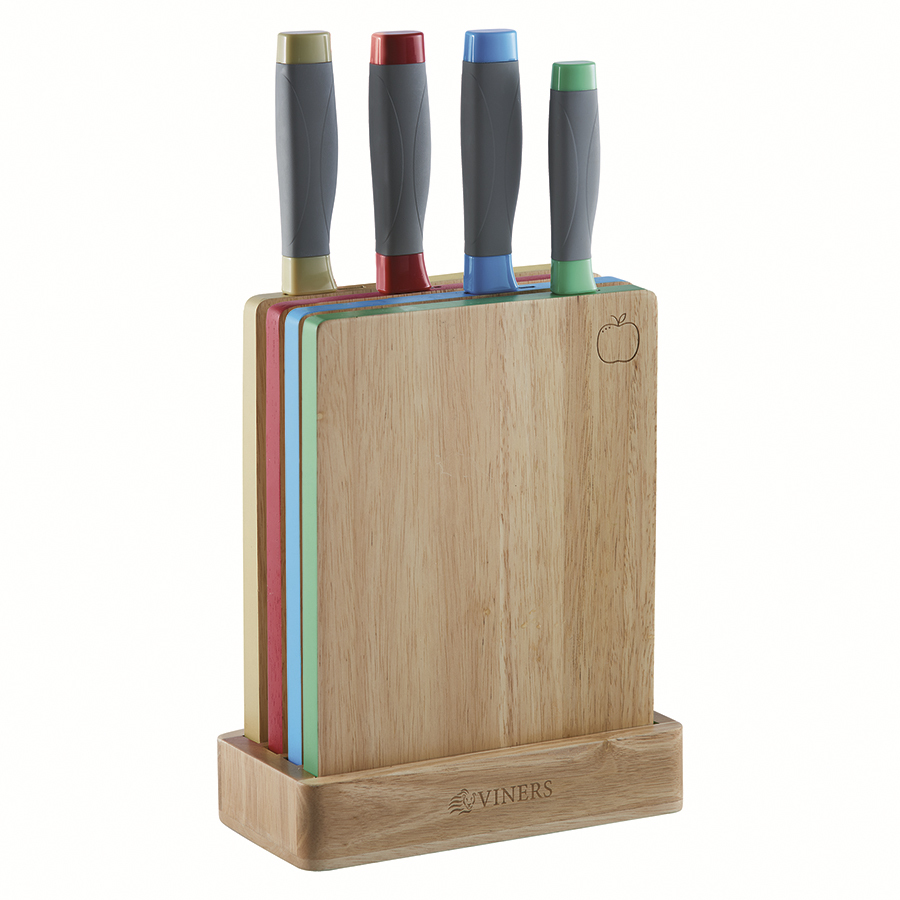 Набор включает четыре ножа и четыре разделоячные доски в деревянной подставке. Каждый из ножей идет в комплекте с конкретной разделочной доской, что позволяет предотвратить перекрестное заражение.