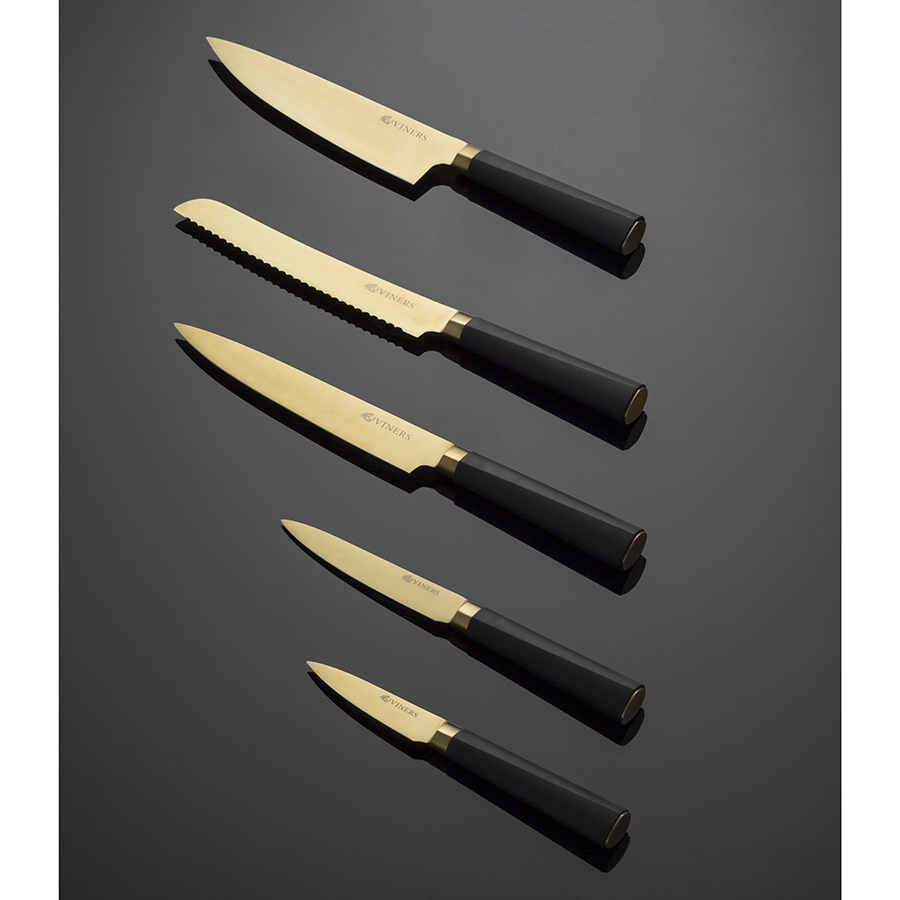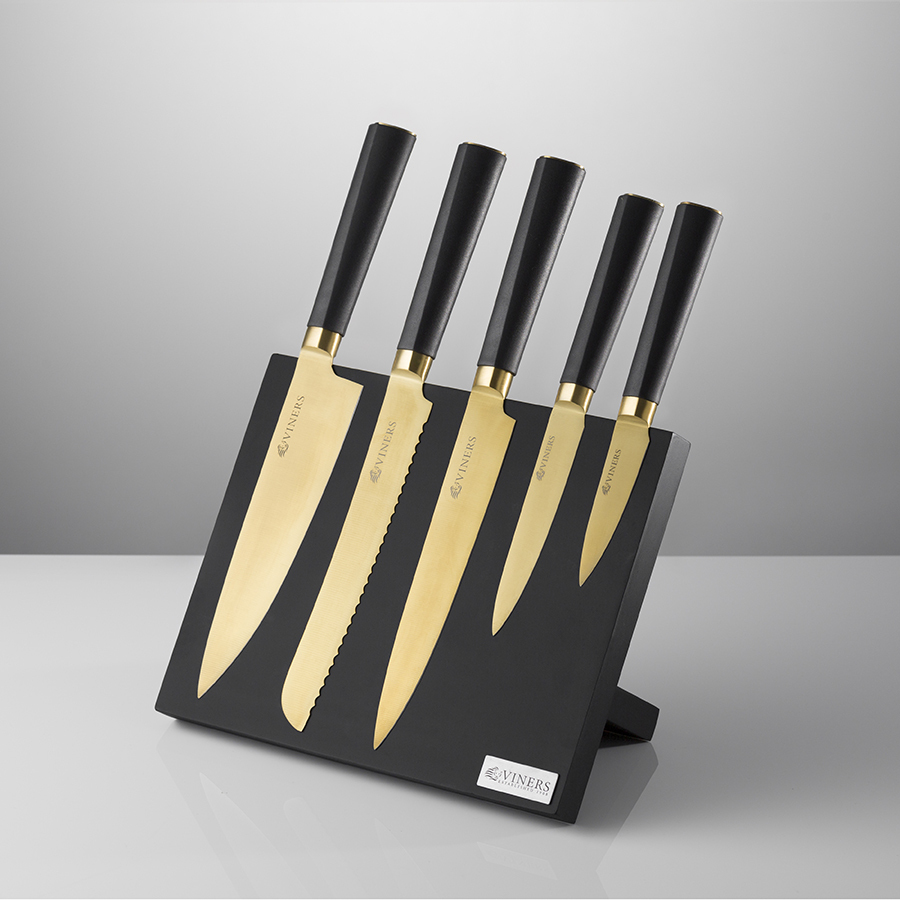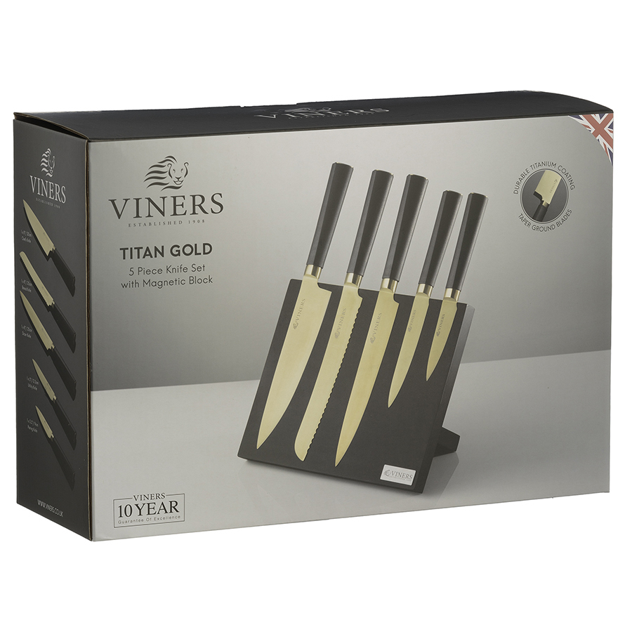 Коллекция ножей Titan отличается современным минималистичным дизайном и безупречной функциональностью. Конические шлифованные лезвия выполнены из нержавеющей стали с прочным титановым покрытием. Ножи отличаются стойкостью к окислению и коррозии. Режущий край клинков надолго сохраняет остроту. Рукоятки из нескользящего материала обеспечивают комфортный захват во время работы. За счет удобного магнитного держателя ножи всегда будут под рукой и готовы к использованию. Рекомендована ручная мойка. В наборе: - нож шефа 20 см; - нож для хлеба 20 см; - нож разделочный для мяса 20 см; - нож универсальный 13 см; - нож для овощей 9 см; - магнитный блок. Производитель рекомендует только ручное мытье. Бренд Viners дает гарантию 10 лет на все кухонные ножи. Материал: нержавеющая сталь, титан.
