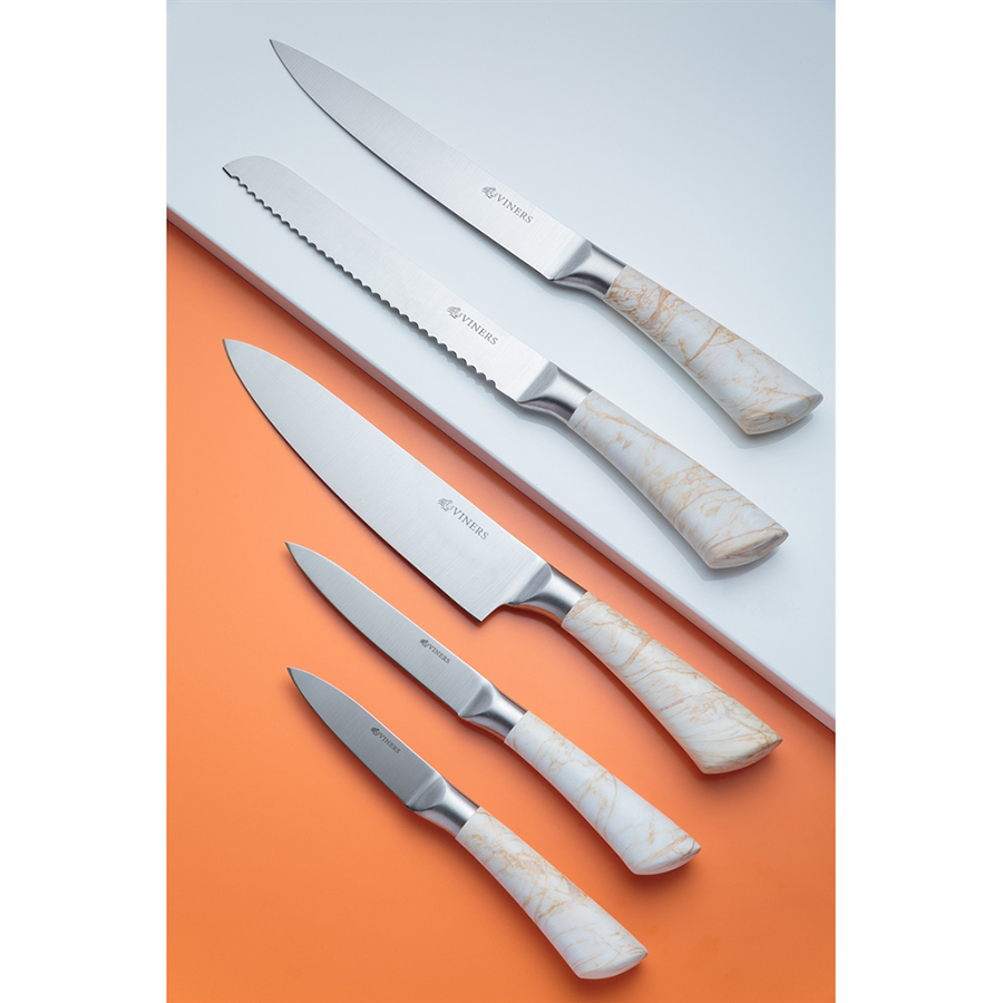 Универсальный набор из 5 ножей для всех видов продуктов: мяса, овощей, фруктов, хлеба и готовых продуктов. Marble — роскошная коллекция ножей из немецкой стали, которая производится по самым высоким стандартам качества. Лезвия выполнены из углеродистой стали. Благодаря этому они обладают повышенной прочностью и годами сохраняют остроту. Ножи оснащены удобными рукоятками из нержавеющей стали, стилизованными под мрамор. С помощью ножей Viners любой повар может добиться безупречных кулинарных результатов. Изысканный набор ножей подчеркнет стиль вашей кухни. Бренд Viners даёт гарантию на коллекцию 25 лет.