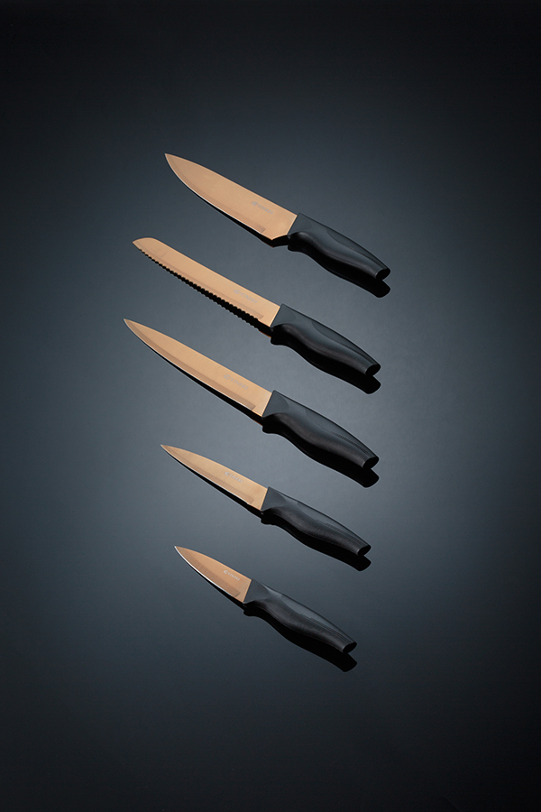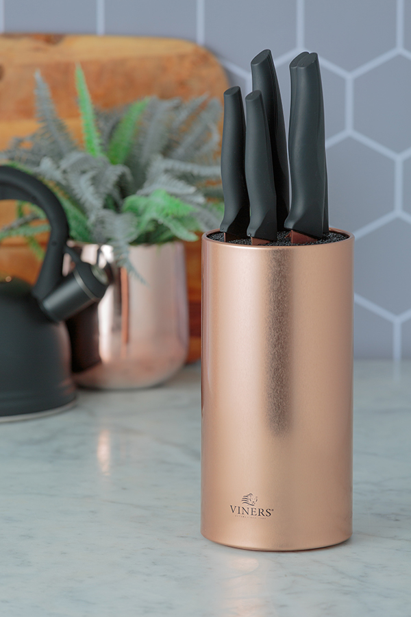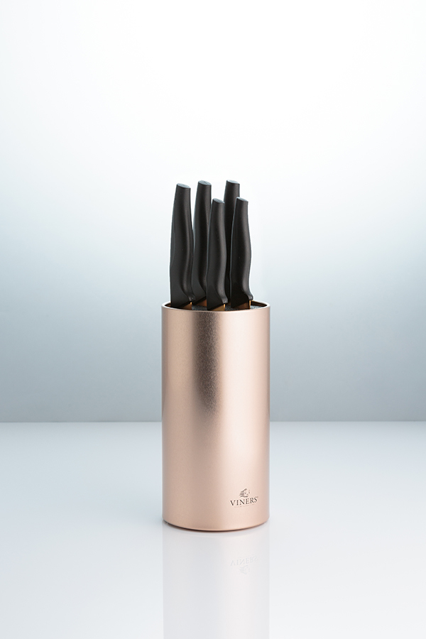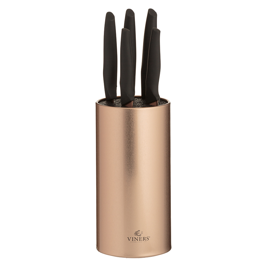 Ножи в подставке Opulence представлены в стильном дизайне. Благодаря безупречной функциональности изделия станут незаменимы на профессиональной и домашней кухне. Конические шлифованные лезвия выполнены из нержавеющей стали и покрыты медью. Ножи отличаются стойкостью к окислению и коррозии. Режущий край клинков надолго сохраняет остроту. Мягкие рукоятки из нескользящего материала обеспечивают комфортный захват во время работы. Блок с приятным на ощупь наполнителем прочно удерживает ножи внутри и защищает лезвия от повреждений.