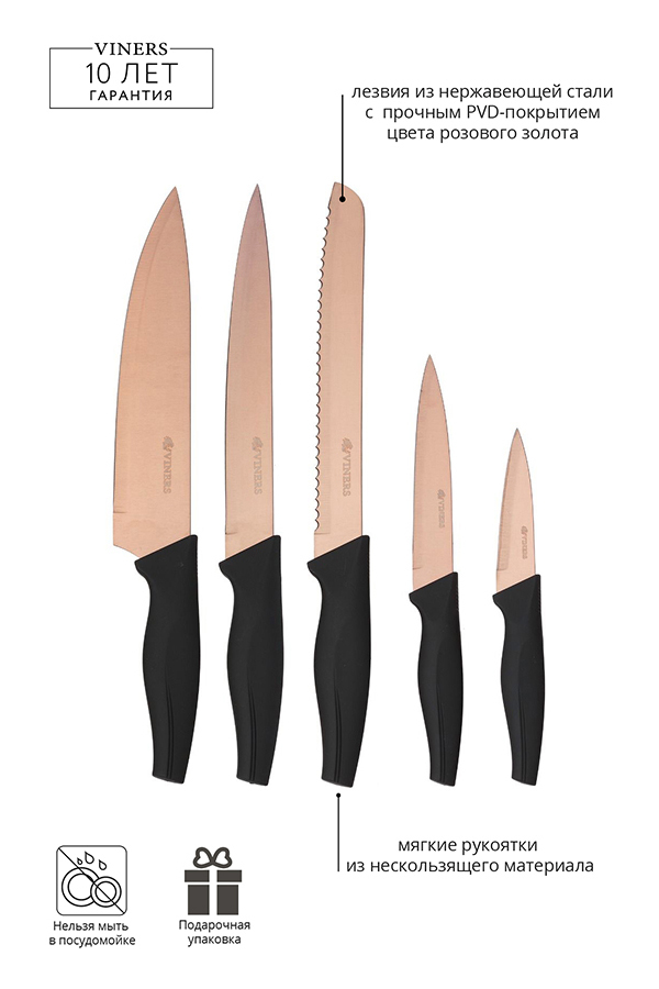 Производитель рекомендует только ручное мытье. Бренд Viners дает гарантию 10 лет на все кухонные ножи. Набор поступает в продажу в фирменной упаковке.