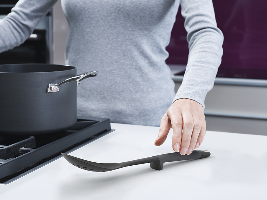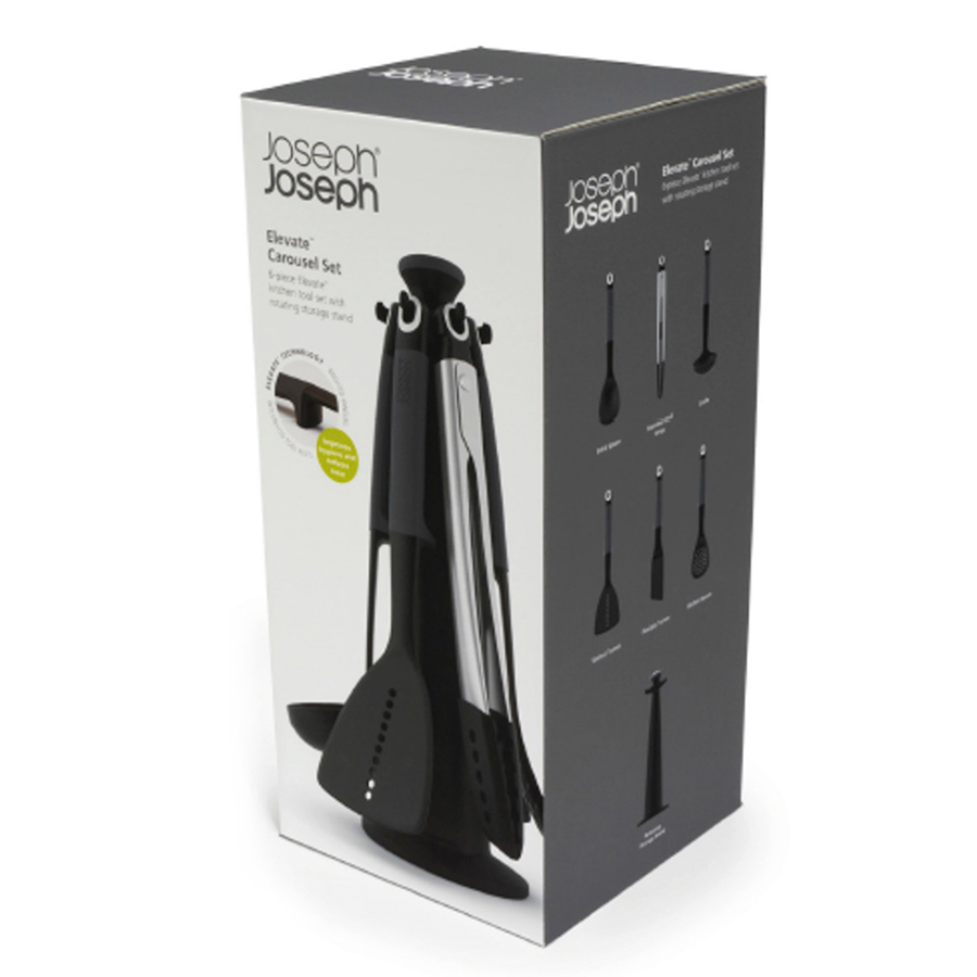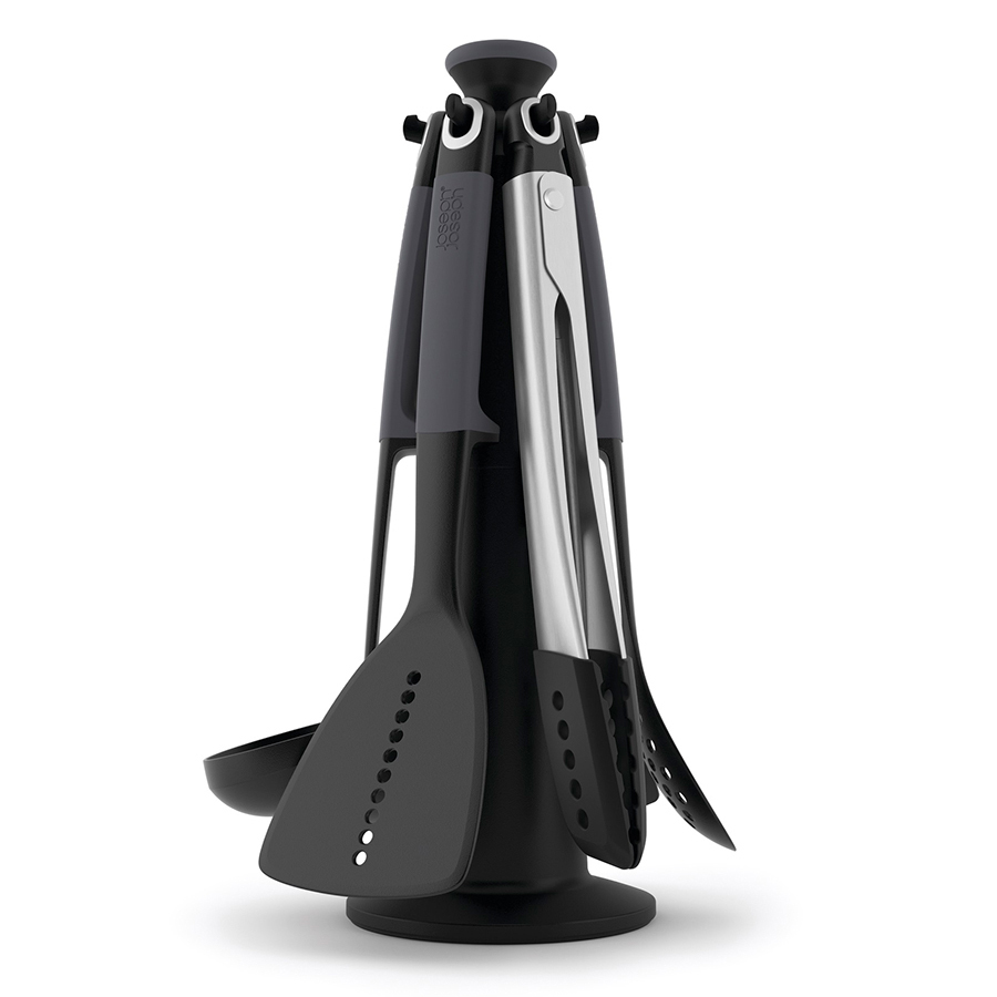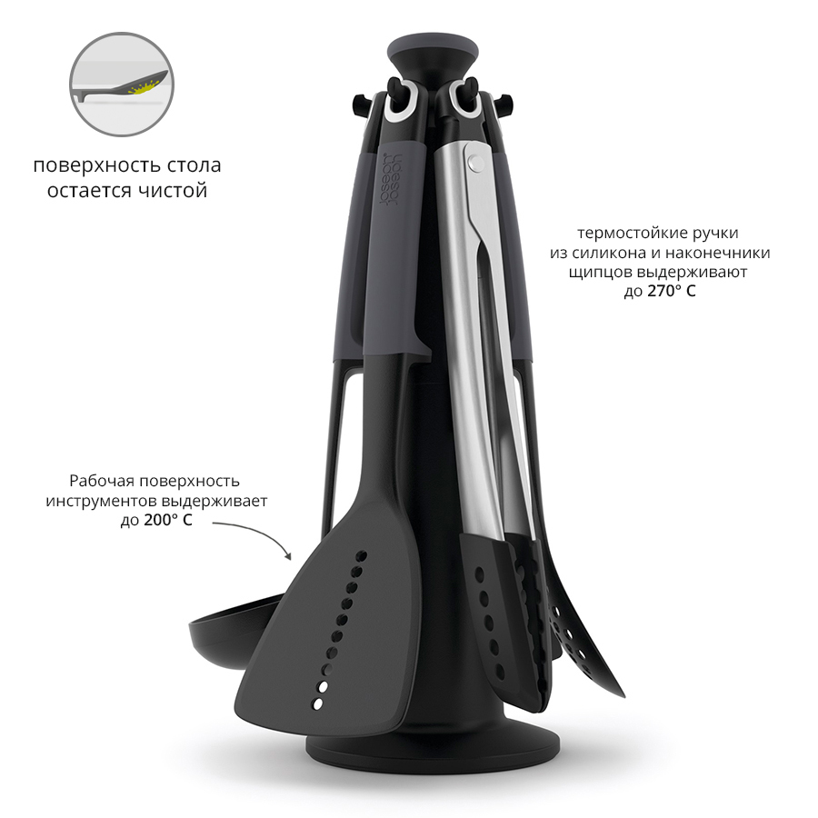 Набор из 6 кухонных инструментов с щипцами на вращающейся подставке. Входит в серию кухонных приборов Elevate™ , разработанную с целью минимизировать беспорядок во время готовки. Каждый прибор оснащён инновационной утяжеленной ручкой, благодаря которой испачканная часть инструмента всегда остаётся навесу и не касается рабочей поверхности. Удобная вращающаяся подставка обеспечит легкий доступ к нужному прибору. В набор входит: - Поварская ложка - Гибкая лопатка - Шумовка - Щипцы - Лопатка-шумовка - Половник - Подставка-карусель Рабочая поверхность инструментов выдерживает до 200° С, эргономичные термостойкие ручки из силикона - до 270° С. Силиконовые наконечники щипцов также выдерживают нагревание до 270°C. Подходят для любого типа посуды. Инструменты можно мыть в посудомоечной машине, подставку - протирать влажной тканью.