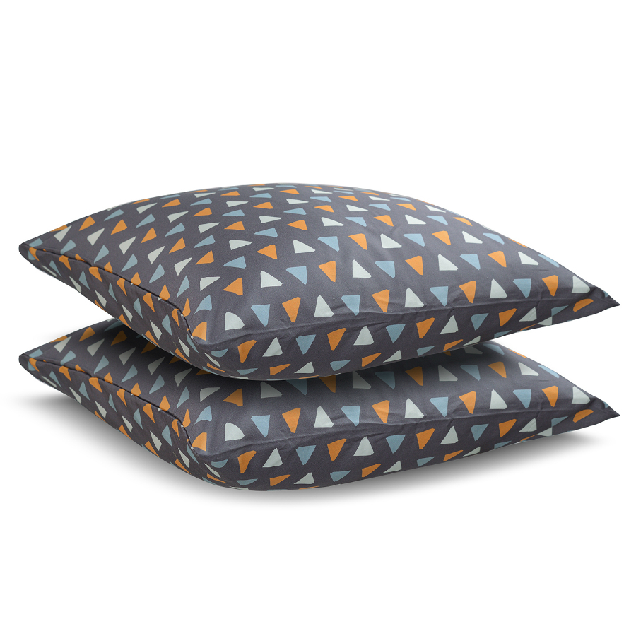 Комплект из двух наволочек с геометричным принтом Triangles в сочетании с насыщенным темно-серым цветом станет прекрасным дизайнерским акцентом в интерьере любой спальни. Гладкий, приятный на ощупь материал плотностью 210 ТС отличается особым способом пряжи – нити переплетаются в скрученном виде, что придает ткани дополнительную прочность.