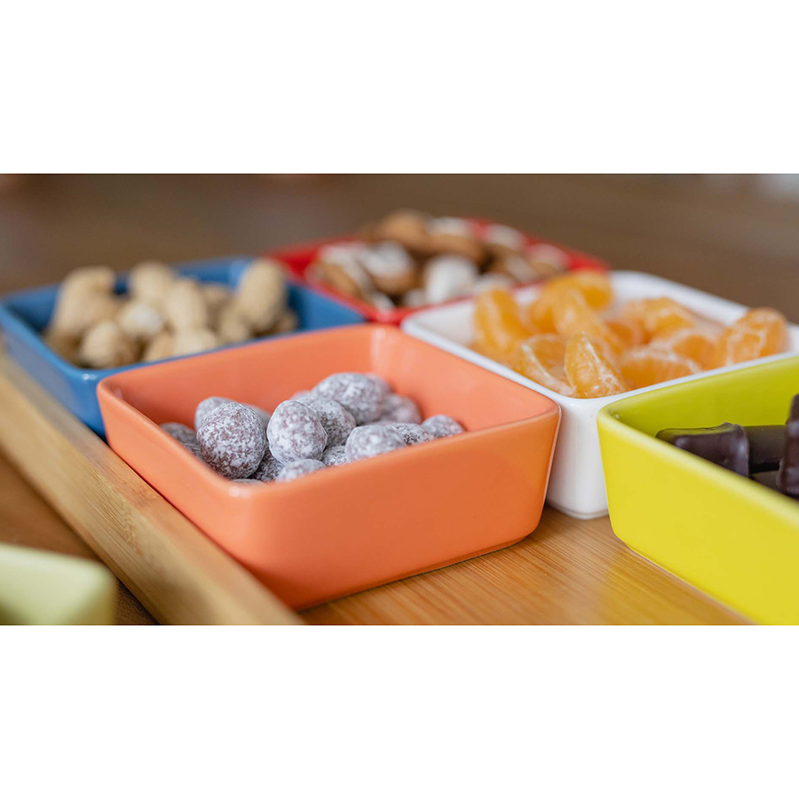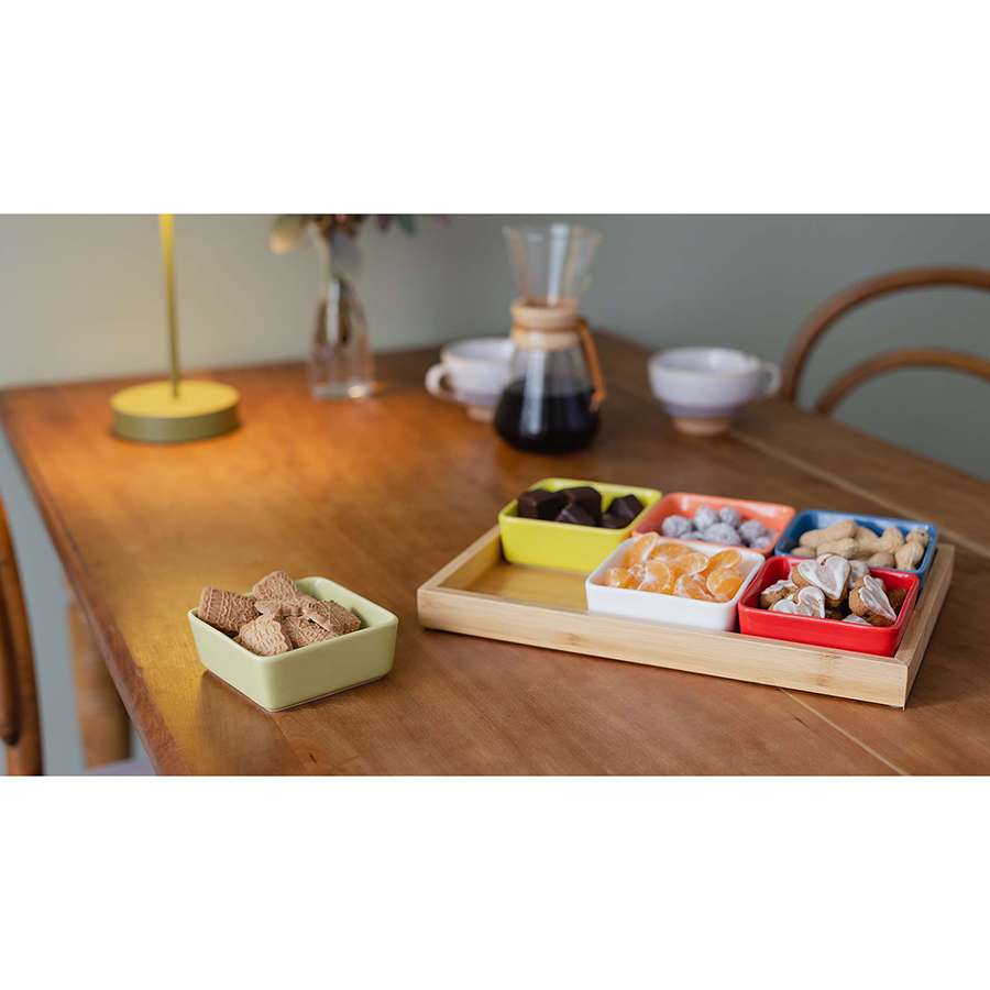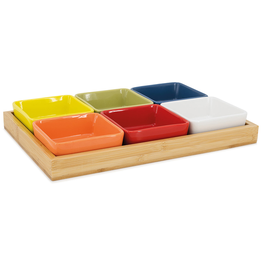 Емкости выполнены из высококачественного фарфора. Поднос – из натурального бамбука. Размер подноса (ВхШхГ): 5х33х22,5 см