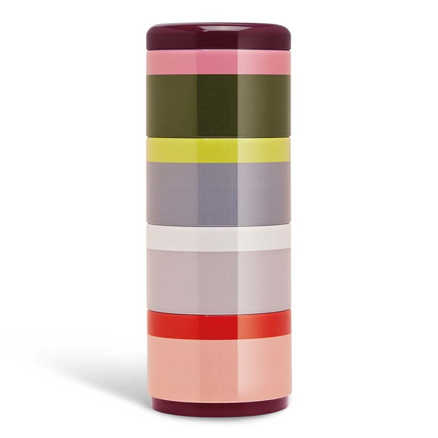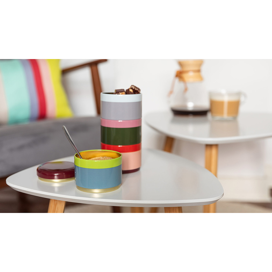 В комплект входят 4 жестяных контейнера, которые ставятся один на другой. Набор поставляется с крышкой. Материал безопасен для пищевых продуктов.