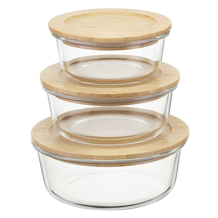 Материалы: боросиликатное стекло, бамбук, силикон. Объем: 400 мл, 650 мл, 950 мл. Размеры: малый – 13х13х6 см; средний – 15х15х6,5 см; большой – 17,5х17,5х7 см. Количество предметов в наборе: 3 шт.