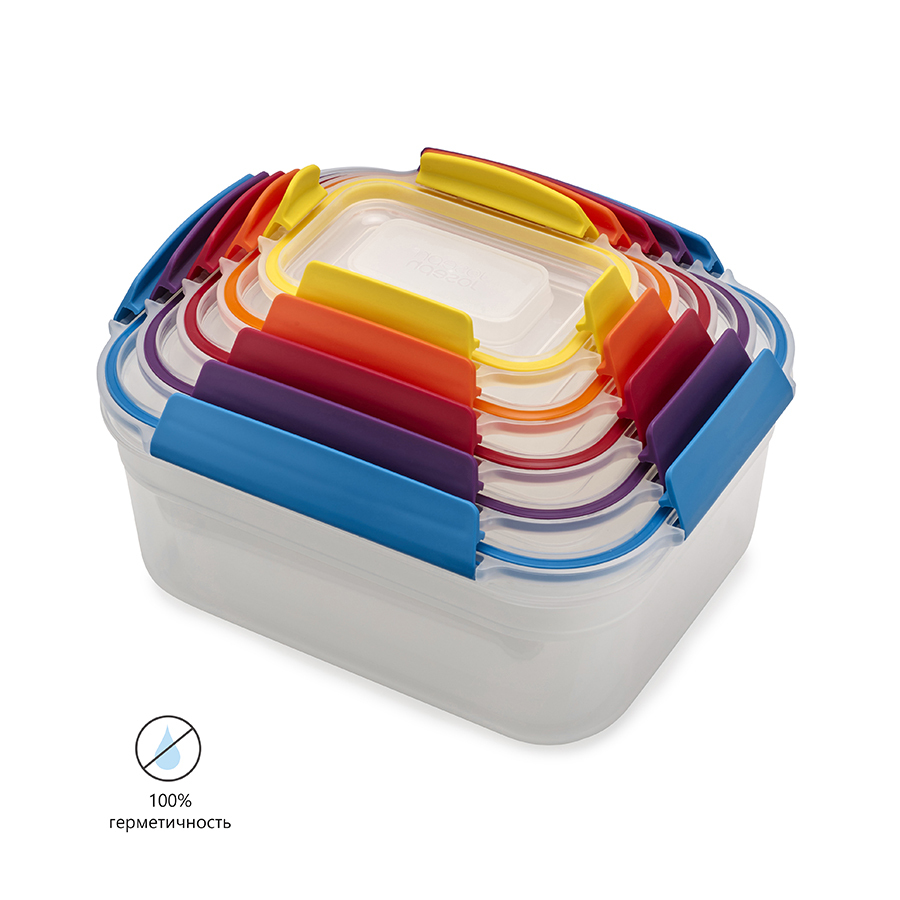 Как известно, обычные емкости для хранения продуктов, когда не используются, занимают очень много ценного пространства в кухонном шкафу. Крышки и контейнеры часто теряются или не соответствуют друг другу по размеру. Компактный набор из 4 контейнеров Nest™ Lock представляет собой удачное решение этой проблемы. Продуманный дизайн позволяет компактно хранить контейнеры на полке.