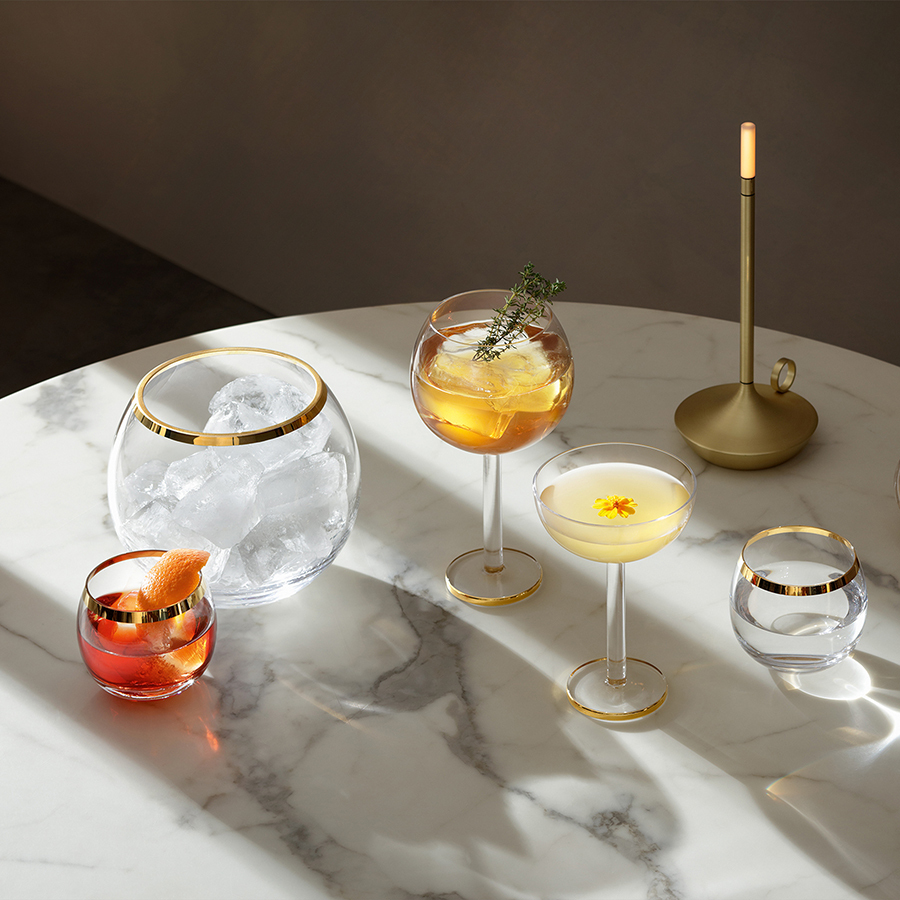 Luca – коллекция посуды необычной округлой формы с минималистичным декором в виде золотистой каймы, выполненная из выдувного стекла ручным способом.