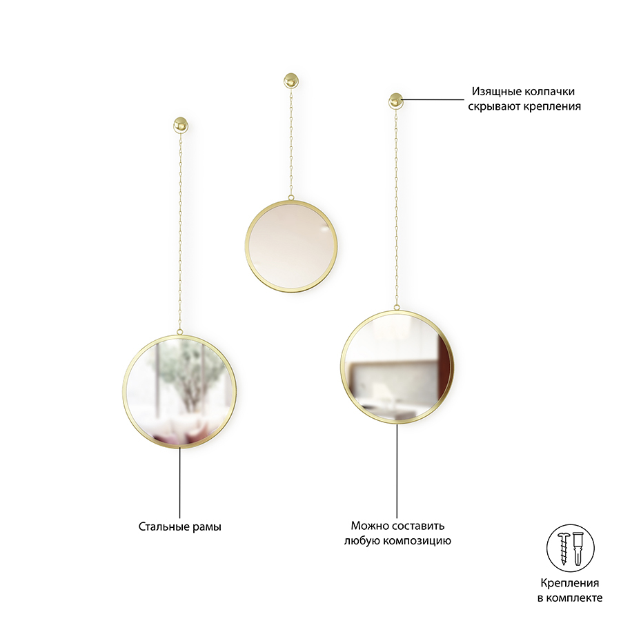 Зеркала в металлических рамах с подвесом на металлических цепочках. Крепятся к стене при помощи шурупов и дюбелей, которые закрываются декоративными металлическими заглушками. Крепления входят в комплект.