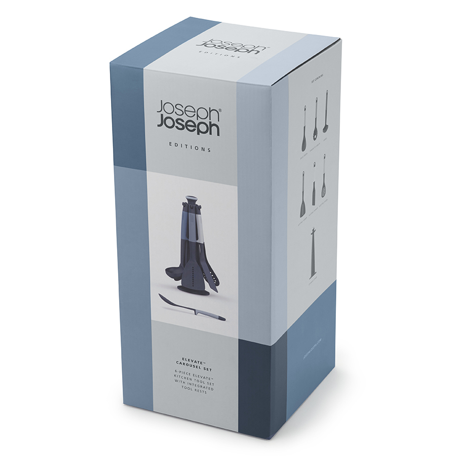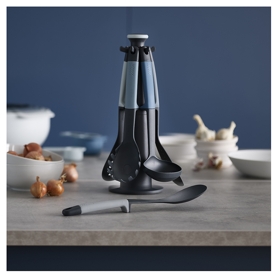 Набор кухонных инструментов в новой цветовой гамме входит в серию Elevate™, разработанную с целью минимизировать беспорядок во время готовки. Каждый прибор оснащен инновационной утяжеленной ручкой, благодаря которой испачканная часть инструмента всегда остается на весу и не касается рабочей поверхности. Удобная вращающаяся подставка с нескользящим основанием обеспечит легкий доступ к нужному аксессуару. Набор Elevate выдерживает температуру до 200°С, а термостойкие силиконовые ручки до 270°С. Приборы можно мыть в посудомоечной машине. Подставку рекомендуется протирать влажной тканью. В набор входит: - ложка - ложка-шумовка - ложка для спагетти - половник - лопатка - лопатка-шумовка - подставка.