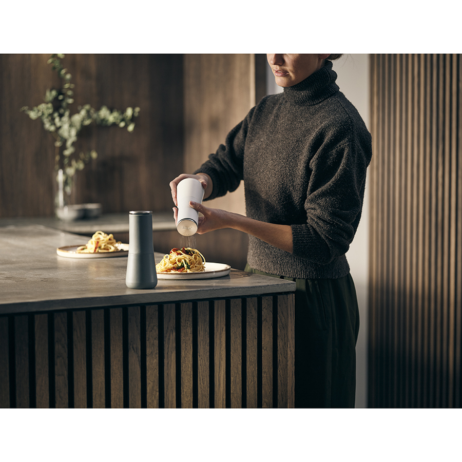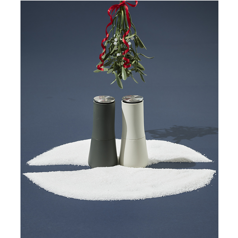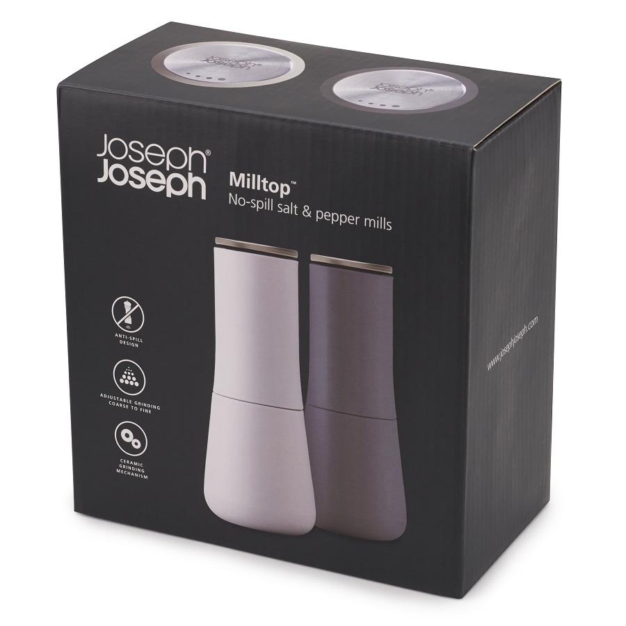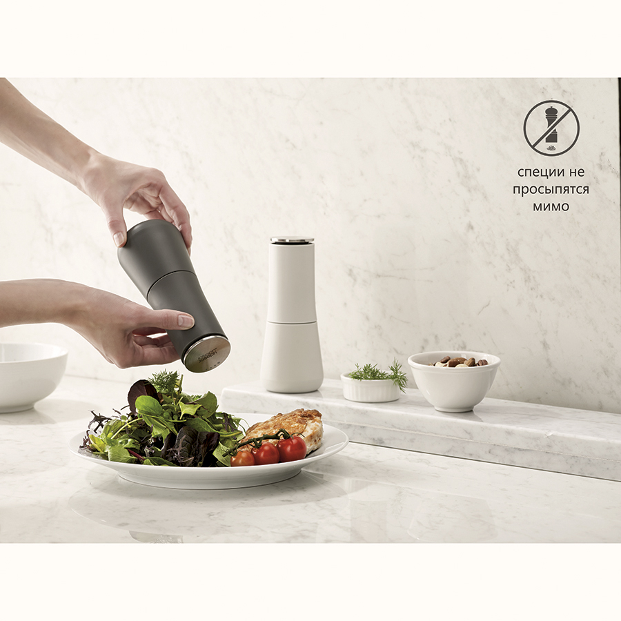 Для использования необходимо перевернуть мельницу вверх дном и повернуть основание. Внутри расположена надежная керамическая мельница. С помощью вращающейся верхней части девайса можно регулировать размер помола соли и перца. Изделия выполнены из высококачественного пластика.