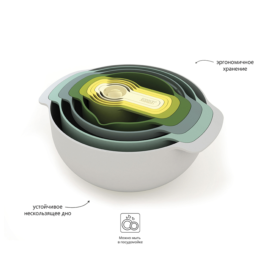 Все чаши помещаются друг в друга, что существенно экономит место для хранения. Миски изготовлены из качественного полипропилена, который не деформируется и не выделяет вредные вещества. У всех предметов нескользящее дно и эргономичные ручки.