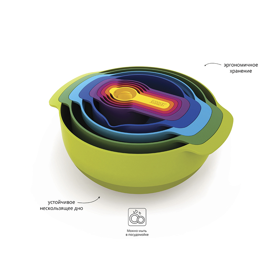 Бестселлер от Joseph Joseph. В набор входит 9 ёмкостей и инструментов для готовки. Все предметы оснащены удобными ручками и нескользящим дном. Благодаря инновационному дизайну ёмкости компактно складываются одна в другую и занимают абсолютный минимум места — где бы они ни хранились. В набор входит: - Малая миска с мерными делениями – 0,5 л. - Сито – 1,65 л. - Дуршлаг – 3 л. - Большая миска с нескользящим дном – 4,5 л. - 5 чаш для измерения ингредиентов объёмом: 1 столовая ложка (плюс есть возможность отмерить 1 чайную ложку) - 15 мл. (5 мл.) 1/4 стакана – 60 мл. 1/3 стакана – 80 мл. 1/2 стакана – 125 мл. 1 стакан – 250 мл.