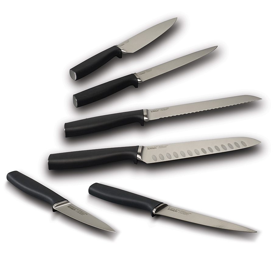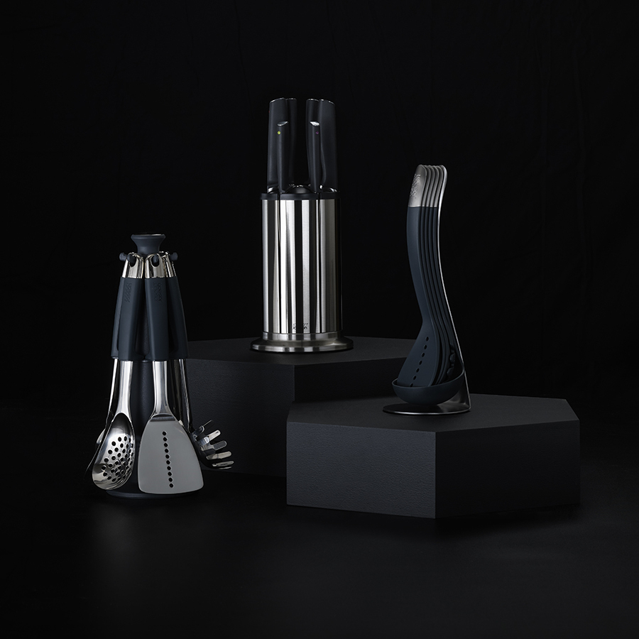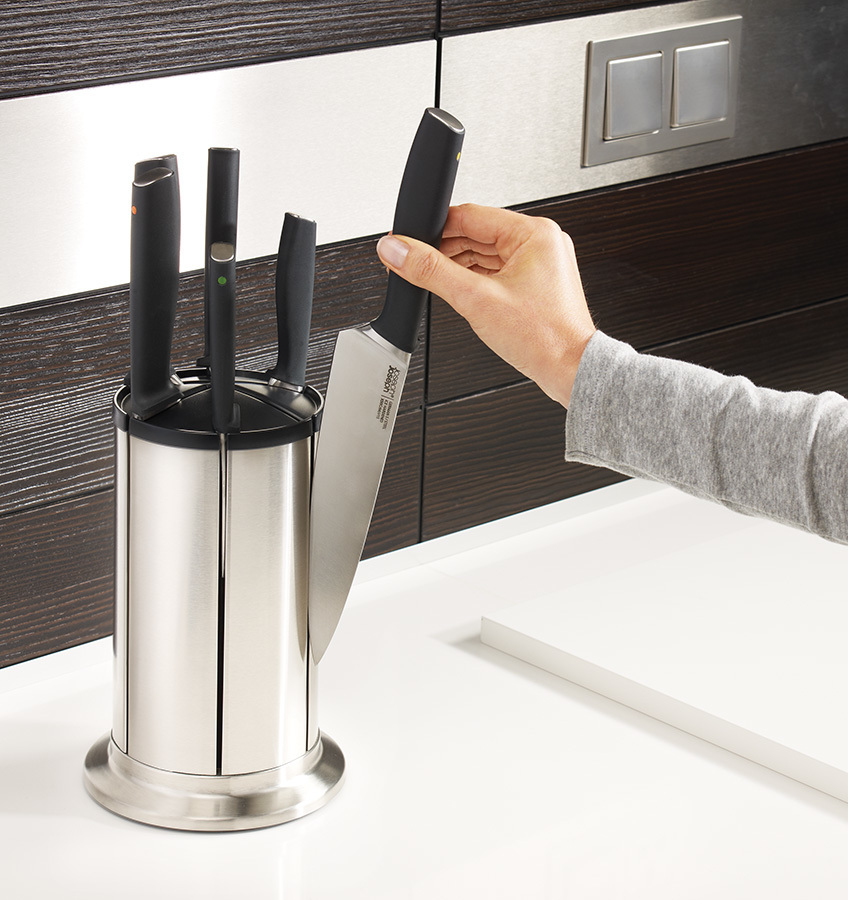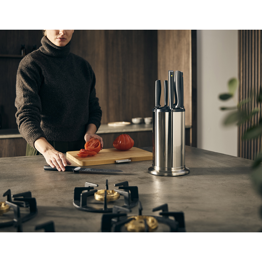 Набор входит в серию кухонных приборов Elevate™, разработанную с целью минимизировать беспорядок во время готовки. Ножи Коллекции 100 сделаны из немецкой нержавеющей стали X50CrMoV15, которая, по мнению экспертов, обеспечивает оптимальный баланс между прочностью и твердостью лезвия. Ножи из такой стали дольше держат заточку, не меняют цвета, меньше подвержены окислению, идеально подходят для интенсивного использования и долго сохраняют презентабельный внешний вид. Каждый нож оснащён утяжеленной ручкой на подножке, благодаря которой лезвие всегда остается навесу и не касается рабочей поверхности. Эргономичные ручки маркированы цветными точками, по которым можно распознать нужный нож при хранении в закрытой подставке. Вращающаяся подставка имеет нескользящее основание и магнитные слоты для ножей, которые подходят для всех типов лезвий. Благодаря утяжеленным ручкам на подножках ножи не касаются рабочей поверхности. Ножи рекомендуется мыть вручную и вытирать насухо, подставку протирать влажной тканью.