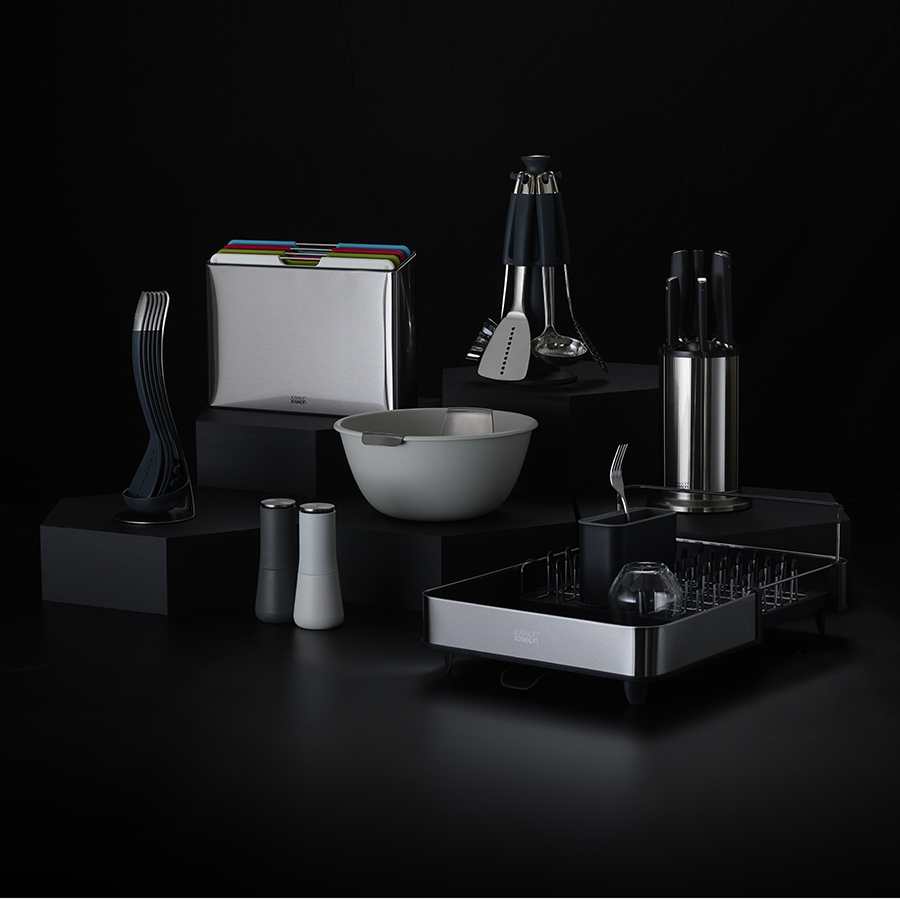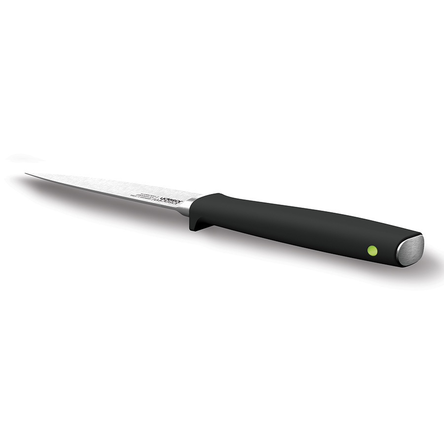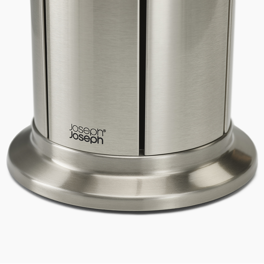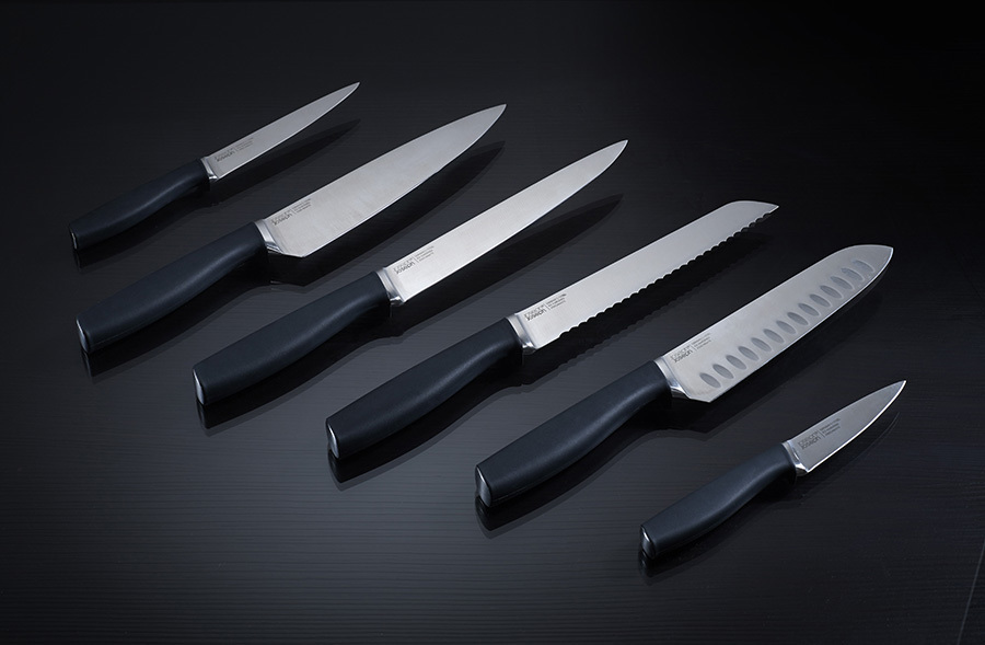 Набор входит в серию кухонных приборов Elevate™, разработанную с целью минимизировать беспорядок во время готовки. Ножи Коллекции 100 сделаны из немецкой нержавеющей стали X50CrMoV15, которая, по мнению экспертов, обеспечивает оптимальный баланс между прочностью и твердостью лезвия. Ножи из такой стали дольше держат заточку, не меняют цвета, меньше подвержены окислению, идеально подходят для интенсивного использования и долго сохраняют презентабельный внешний вид. Каждый нож оснащён утяжеленной ручкой на подножке, благодаря которой лезвие всегда остается навесу и не касается рабочей поверхности. Эргономичные ручки маркированы цветными точками, по которым можно распознать нужный нож при хранении в закрытой подставке. Вращающаяся подставка имеет нескользящее основание и магнитные слоты для ножей, которые подходят для всех типов лезвий. Благодаря утяжеленным ручкам на подножках ножи не касаются рабочей поверхности. Ножи рекомендуется мыть вручную и вытирать насухо, подставку протирать влажной тканью.