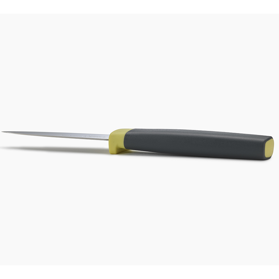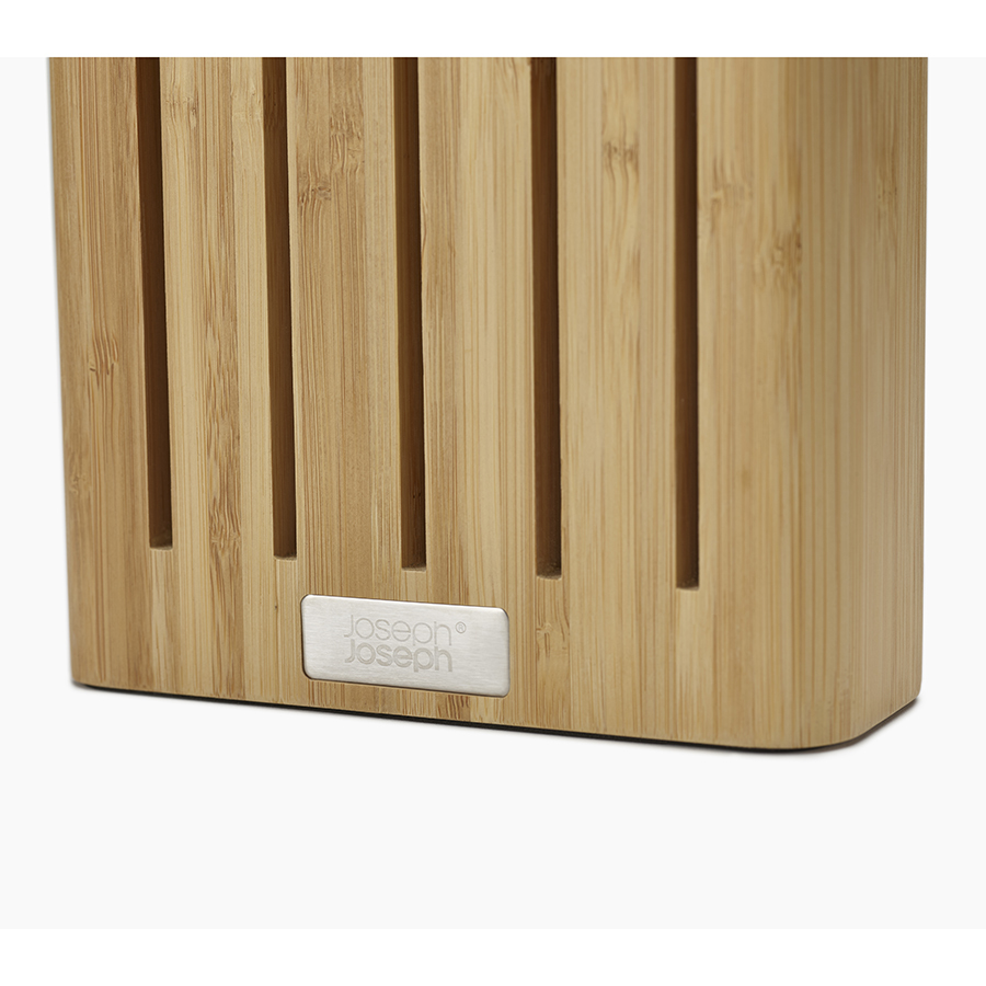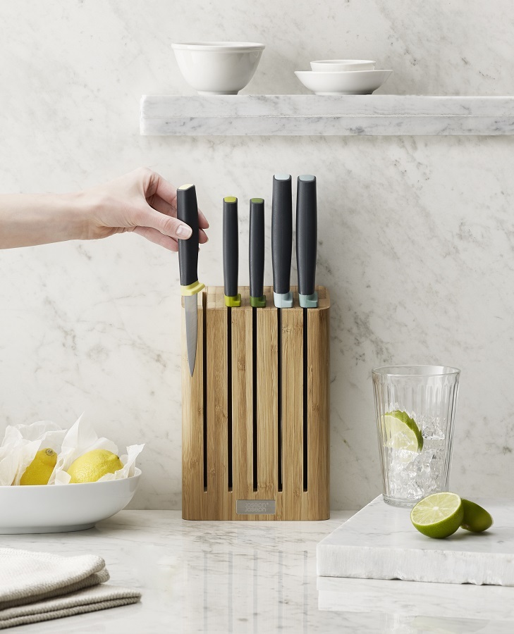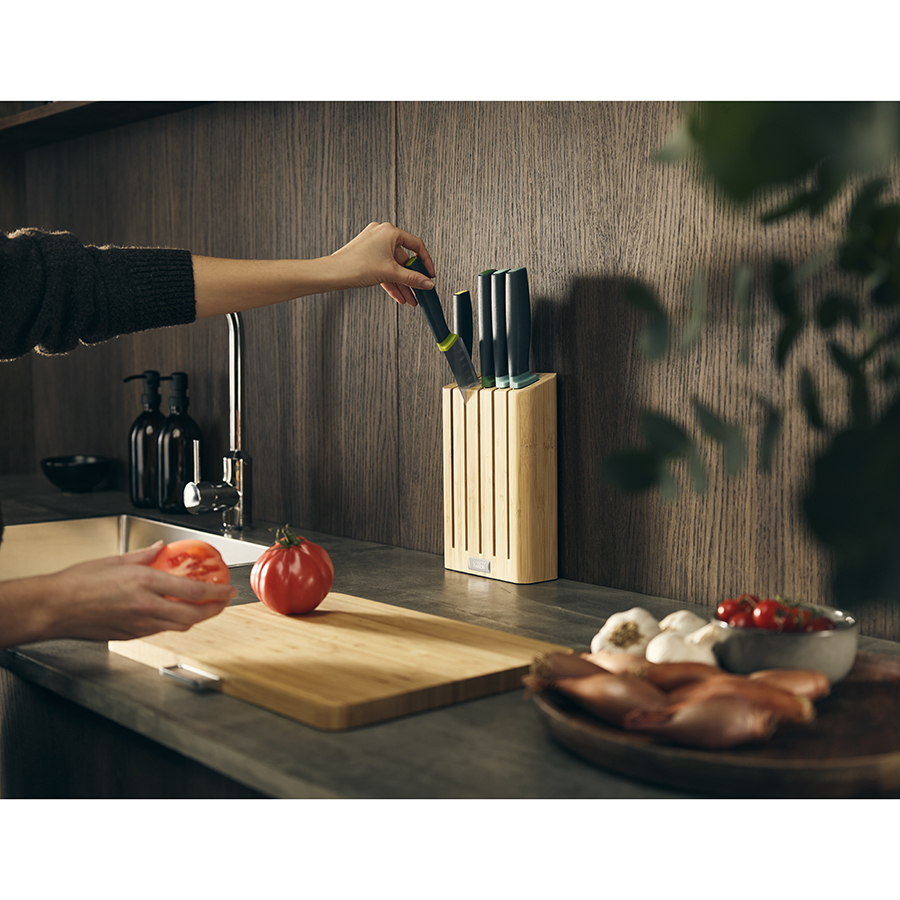 Лезвия из нержавеющей стали обеспечат точность и гладкость реза при обработке мяса, рыбы, овощей и других продуктов. Подставка из бамбука дополнена магнитными пазами, которые надежно удерживают ножи. Для устойчивости блока его основание оборудовано нескользящими ножками. Линейка Elevate создана для сохранения чистоты на кухонных поверхностях во время готовки. Особенность ножей заключается в конструкции ручек. Каждый из инструментов оснащен специальной подставкой и встроенным утяжелителем, который позволяет испачканной части прибора всегда оставаться над столешницей.