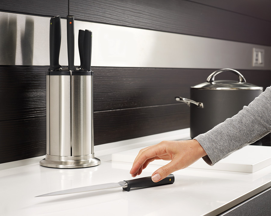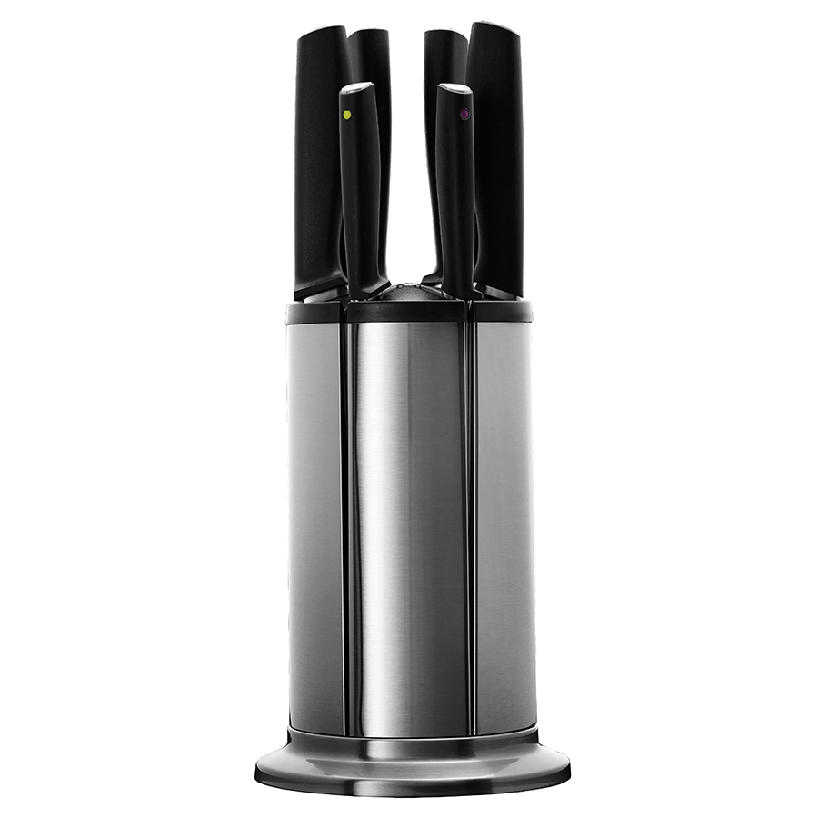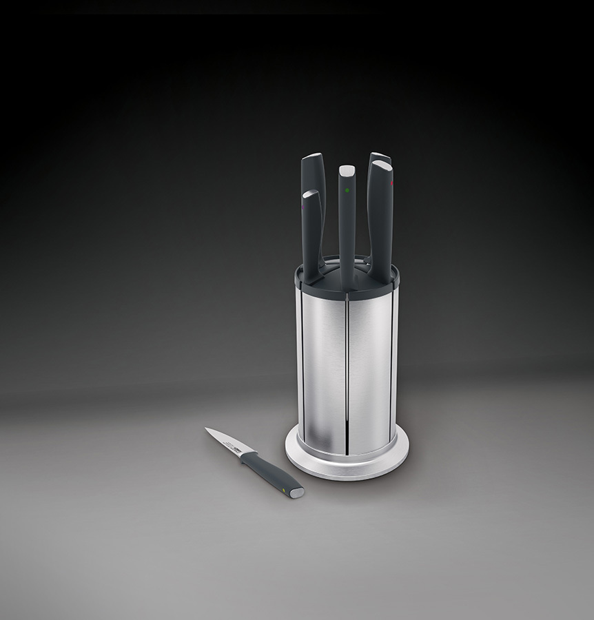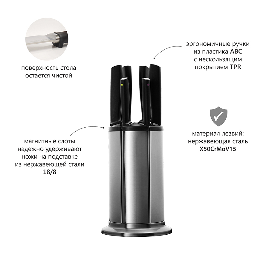 Ножи Коллекции 100 сделаны из немецкой нержавеющей стали X50CrMoV15, которая, по мнению экспертов, обеспечивает оптимальный баланс между прочностью и твердостью лезвия. Ножи из такой стали дольше держат заточку, не меняют цвета, меньше подвержены окислению, идеально подходят для интенсивного использования и долго сохраняют презентабельный внешний вид. Каждый нож оснащён утяжеленной ручкой на подножке, благодаря которой лезвие всегда остается навесу и не касается рабочей поверхности. Эргономичные ручки маркированы цветными точками, по которым можно распознать нужный нож при хранении в закрытой подставке. Вращающаяся подставка имеет нескользящее основание и магнитные слоты для ножей, которые подходят для всех типов лезвий. Благодаря утяжеленным ручкам на подножках ножи не касаются рабочей поверхности.