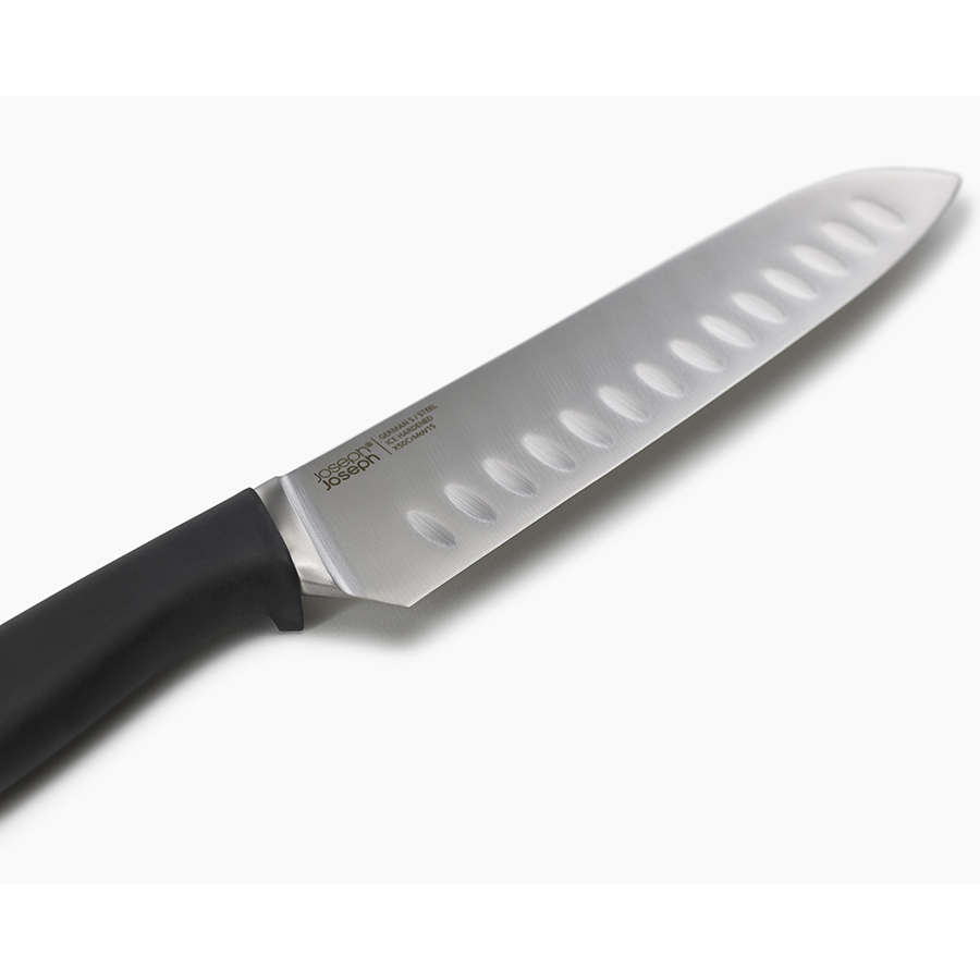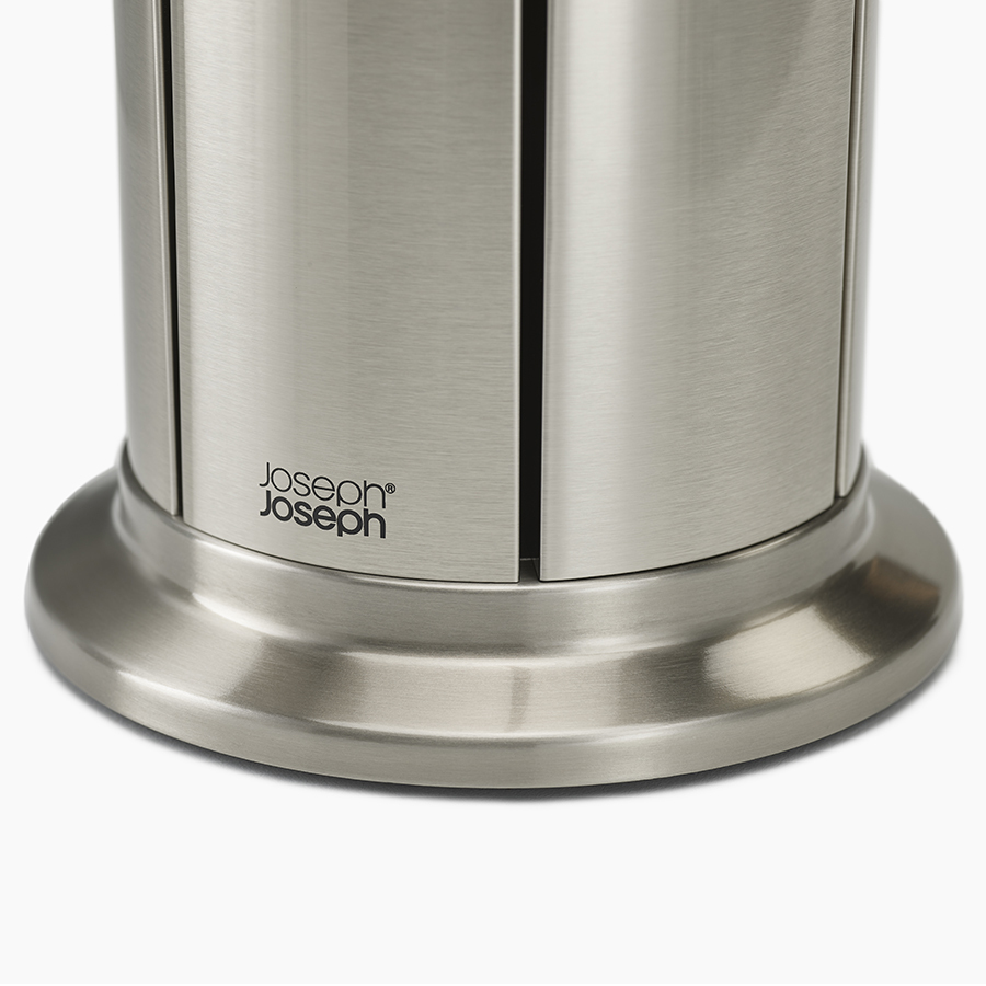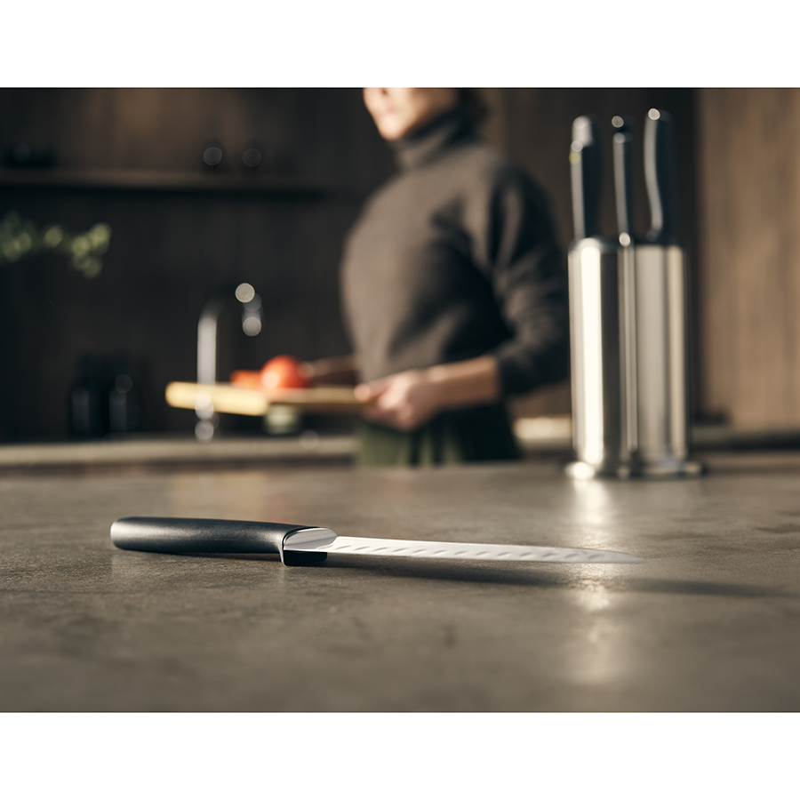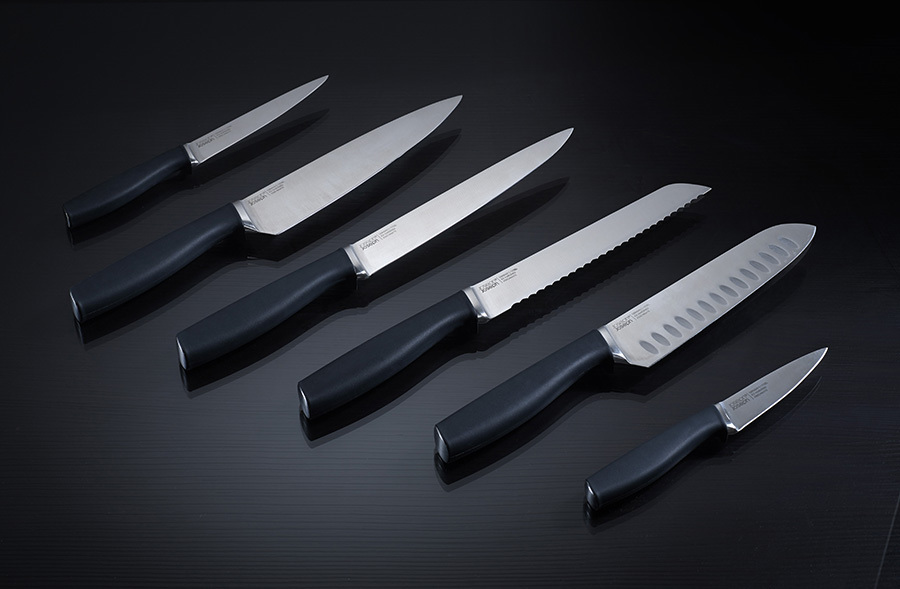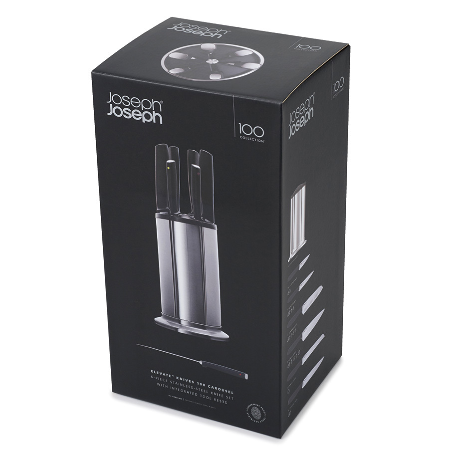 Ножи Коллекции 100 сделаны из немецкой нержавеющей стали X50CrMoV15, которая, по мнению экспертов, обеспечивает оптимальный баланс между прочностью и твердостью лезвия. Ножи из такой стали дольше держат заточку, не меняют цвета, меньше подвержены окислению, идеально подходят для интенсивного использования и долго сохраняют презентабельный внешний вид. Каждый нож оснащён утяжеленной ручкой на подножке, благодаря которой лезвие всегда остается навесу и не касается рабочей поверхности. Эргономичные ручки маркированы цветными точками, по которым можно распознать нужный нож при хранении в закрытой подставке. Вращающаяся подставка имеет нескользящее основание и магнитные слоты для ножей, которые подходят для всех типов лезвий. Благодаря утяжеленным ручкам на подножках ножи не касаются рабочей поверхности.