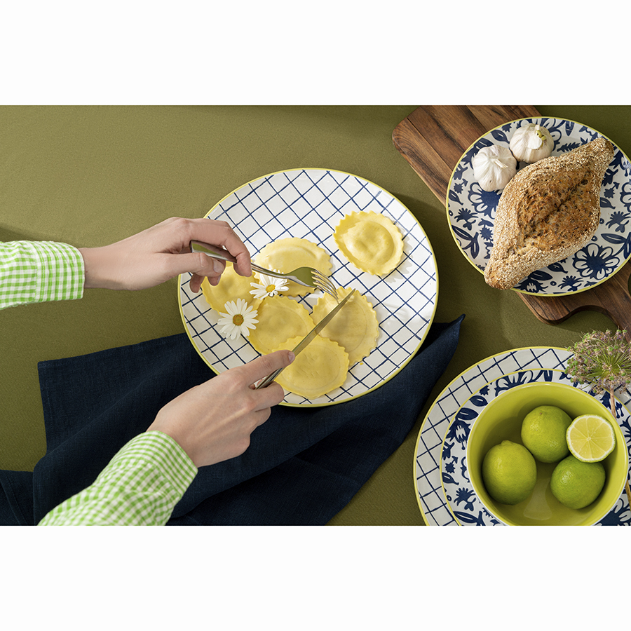 Для создания коллекции Bright Traditions дизайнеры использовали уникальную технологию нанесения орнамента через тиснение и многоступенчатое покрытие полуматовой глазурью. В результате получилась красивая посуда ярких летних оттенков с приятной на ощупь фактурной поверхностью. Комбинация клетки и растительного орнамента делает эту линейку свежим акцентом в любой сервировке.