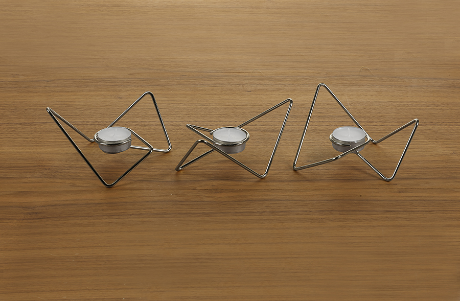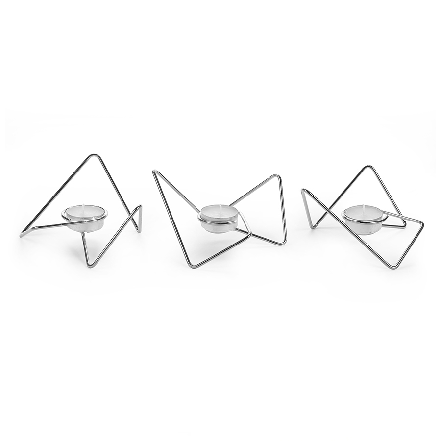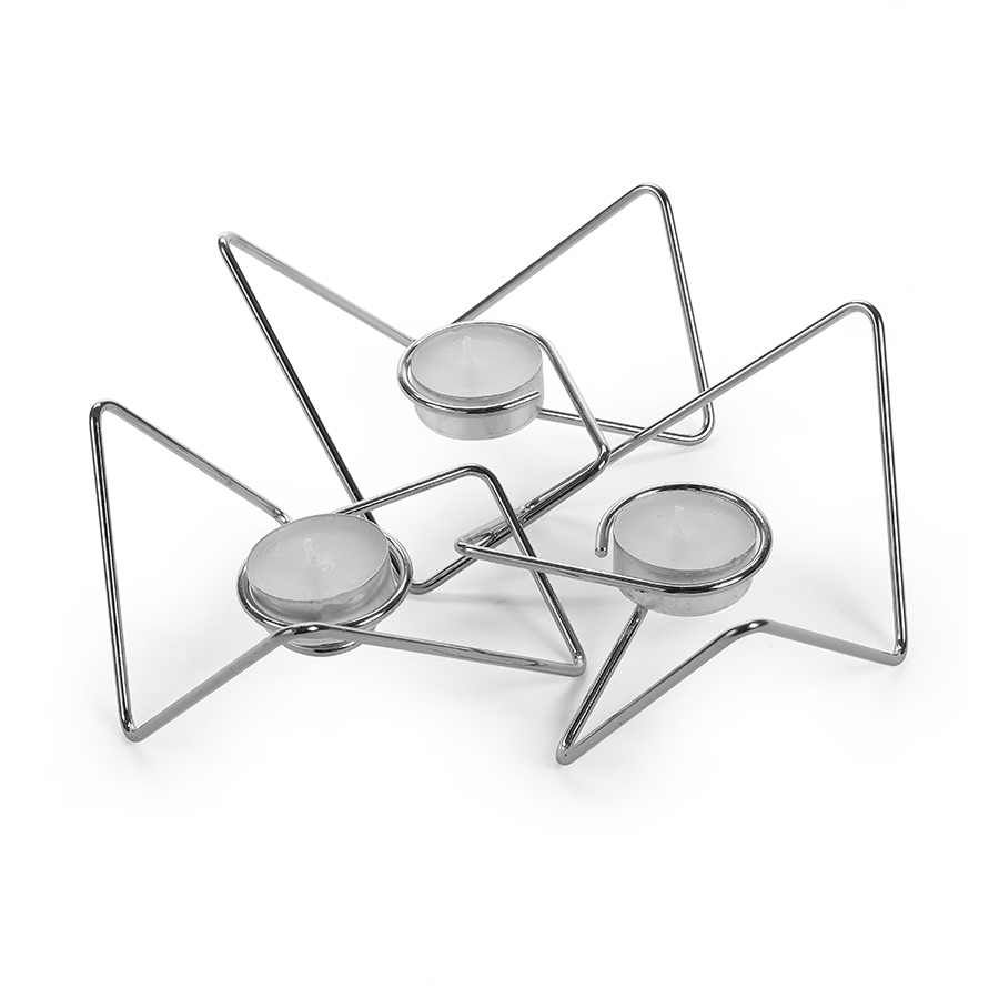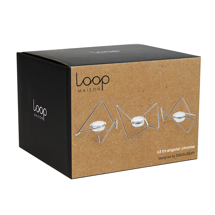 Три элегантных подсвечника, выполненные из хромированной стали. Подходят для стандартных чайных свечей. Каждый подсвечник сделан из единого куска хромированной стали и оригинально изогнут в красивую форму. В центре предусмотрено место для одной чайной свечи. Изделия продаются группой из трех штук. Комплект подсвечников Tri-Angular Loop идеально подойдет для декора кухни, столовой, гостиной или спальни. Использовать их можно как в виде отдельных предметов интерьера, так и соединять вместе, образуя единую композицию. Дополнительной изящности добавят украшения из ягод, цветов и лент. Loop Maison - коллекция украшений для столовой от бренда Black+Blum, вдохновленная кривой Фибоначчи - идеальными пропорциями природы, естественными и визуально притягательными.