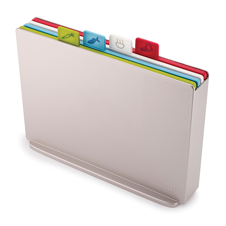Новая интерпретация бестселлера Index. Теперь все доски в наборе с одинаковой плоской поверхностью и закругленными краями, удерживающими сок и крошки. Доски из этого набора можно использовать с двух сторон, не задумываясь. Благодаря обновленной форме кейса набор занимает еще меньше места и вписывается в современные интерьеры кухонь. Простая и вместе с тем эффективная маркировка позволяет легко распределять доски для разных типов продуктов, сохраняя максимальную гигиену в процессе нарезки и исключая взаимное загрязнение продуктов. Специальные ярлыки помогают определить какую доску следует использовать для разных ингредиентов: сырого мяса, овощей, рыбы или же хлеба. Силиконовые ножки на досках препятствуют скольжению. Инновационное покрытие досок не дает ножам затупиться. Размер разделочных досок: длина 34, высота 25, диагональ 42 см.