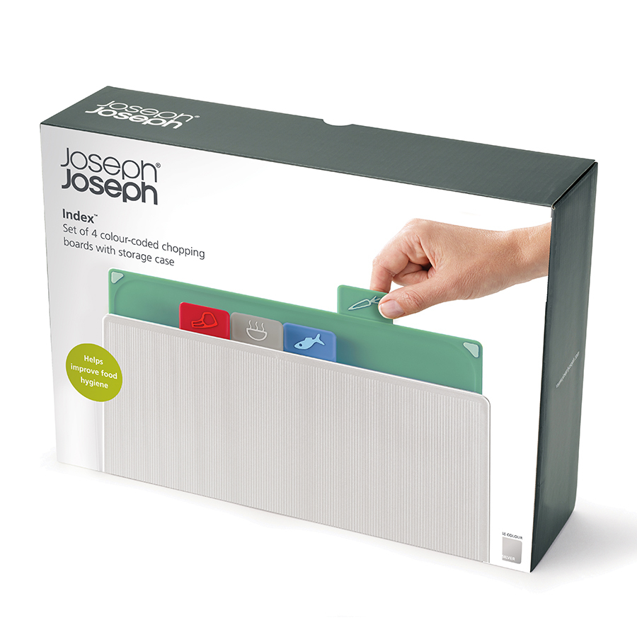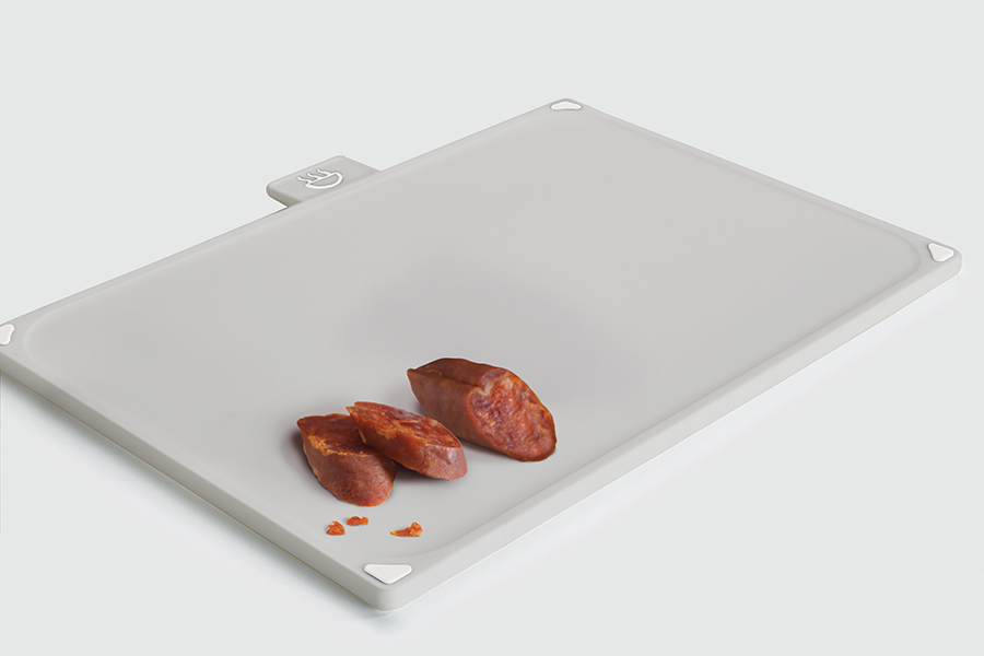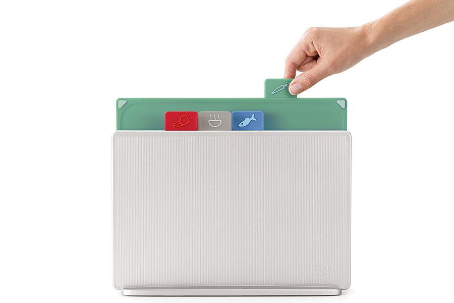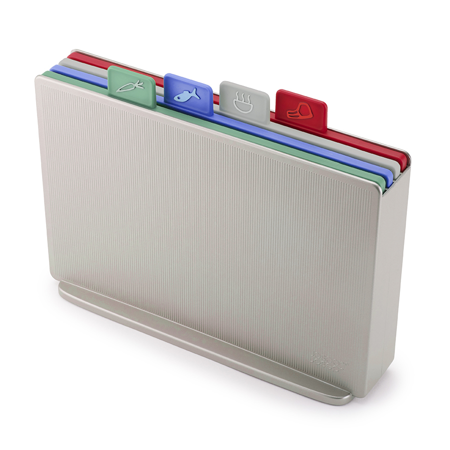 Теперь все доски в наборе с одинаковой плоской поверхностью и закругленными краями, удерживающими сок и крошки. Благодаря обновленной форме кейса набор занимает еще меньше места и вписывается в современные интерьеры кухонь. Простая и вместе с тем эффективная маркировка позволяет легко распределять доски для разных типов продуктов, сохраняя максимальную гигиену в процессе нарезки и исключая взаимное загрязнение продуктов. Специальные ярлыки помогают определить какую доску следует использовать для разных ингредиентов: сырого мяса, овощей, рыбы или же хлеба. Силиконовые ножки на досках препятствуют скольжению. Инновационное покрытие досок не дает ножам затупиться.