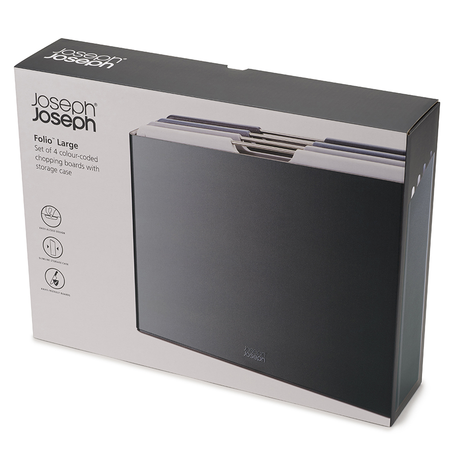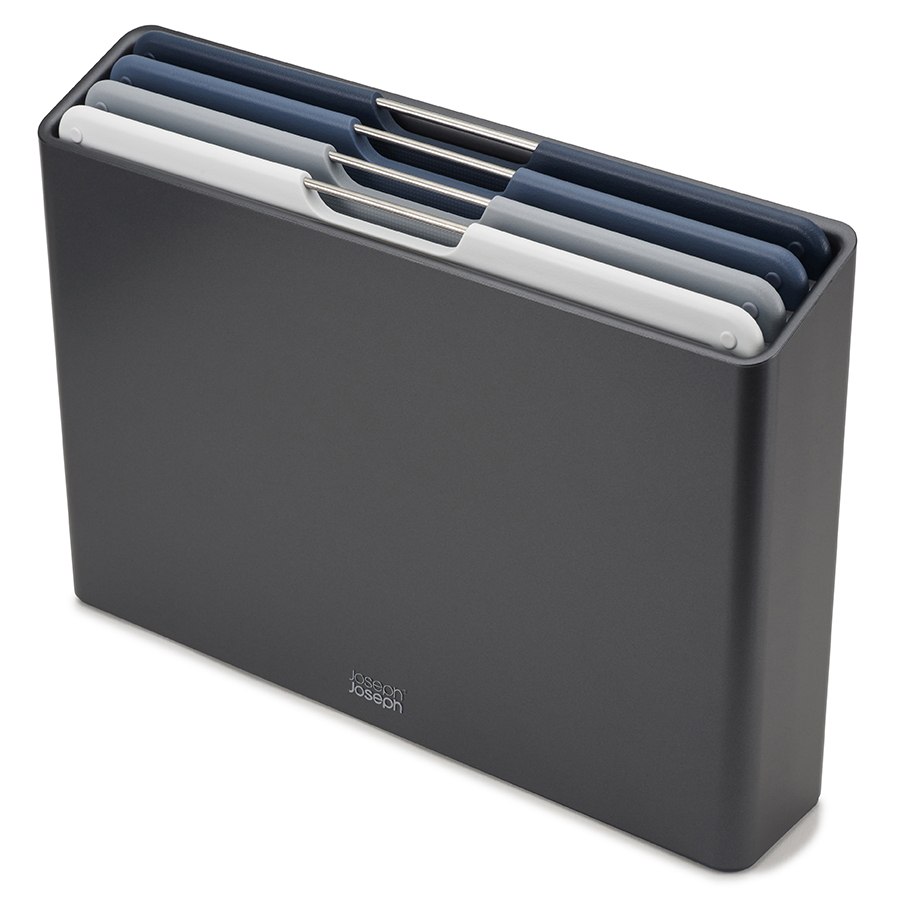 В комплект входит 4 цветных аксессуара с закругленными углами и нескользящими ножками. Небольшие края по контуру удерживают сок и крошки нарезаемых продуктов. При создании изделий мастера используют высококачественный пластик, который не затупляет ножи и при резке не оставляет микроскопических частиц на пище. На текстурированной поверхности досок не заметны царапины. Простая и вместе с тем эффективная цветная кодировка позволяет легко распределять доски для разных типов продуктов, сохраняя максимальную гигиену в процессе нарезки и исключая взаимное загрязнение продуктов. Эргономичная ручка в виде прутика из нержавеющей стали дает возможность легко брать аксессуар во время готовки. Пластиковый кейс для хранения занимает мало места и вписывается в любой интерьер кухни. Подставка удерживает аксессуары на расстоянии, позволяя воздуху равномерно циркулировать между ними.