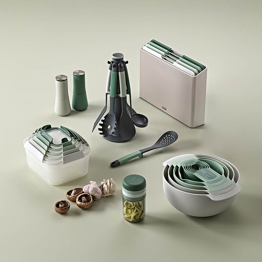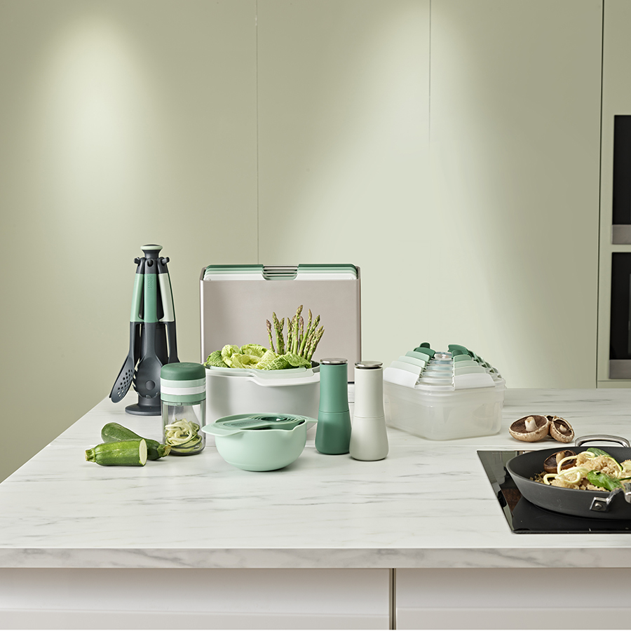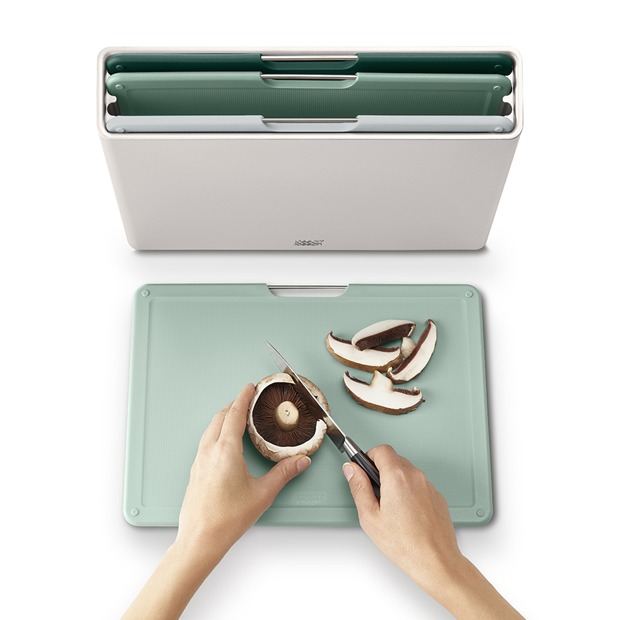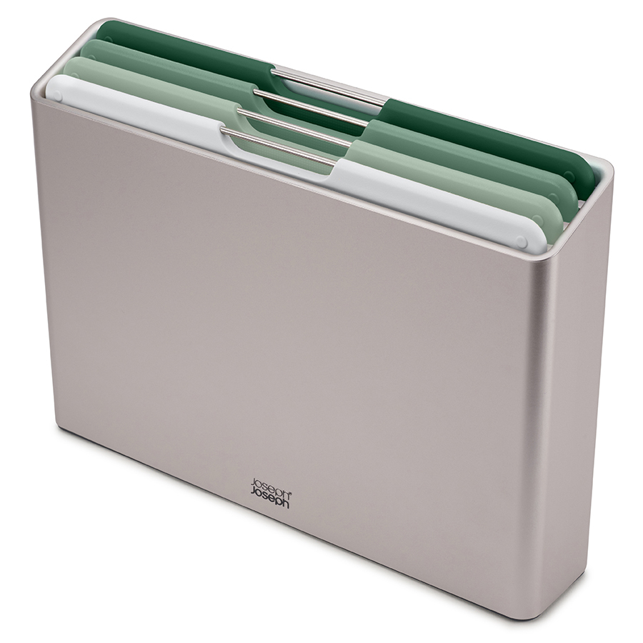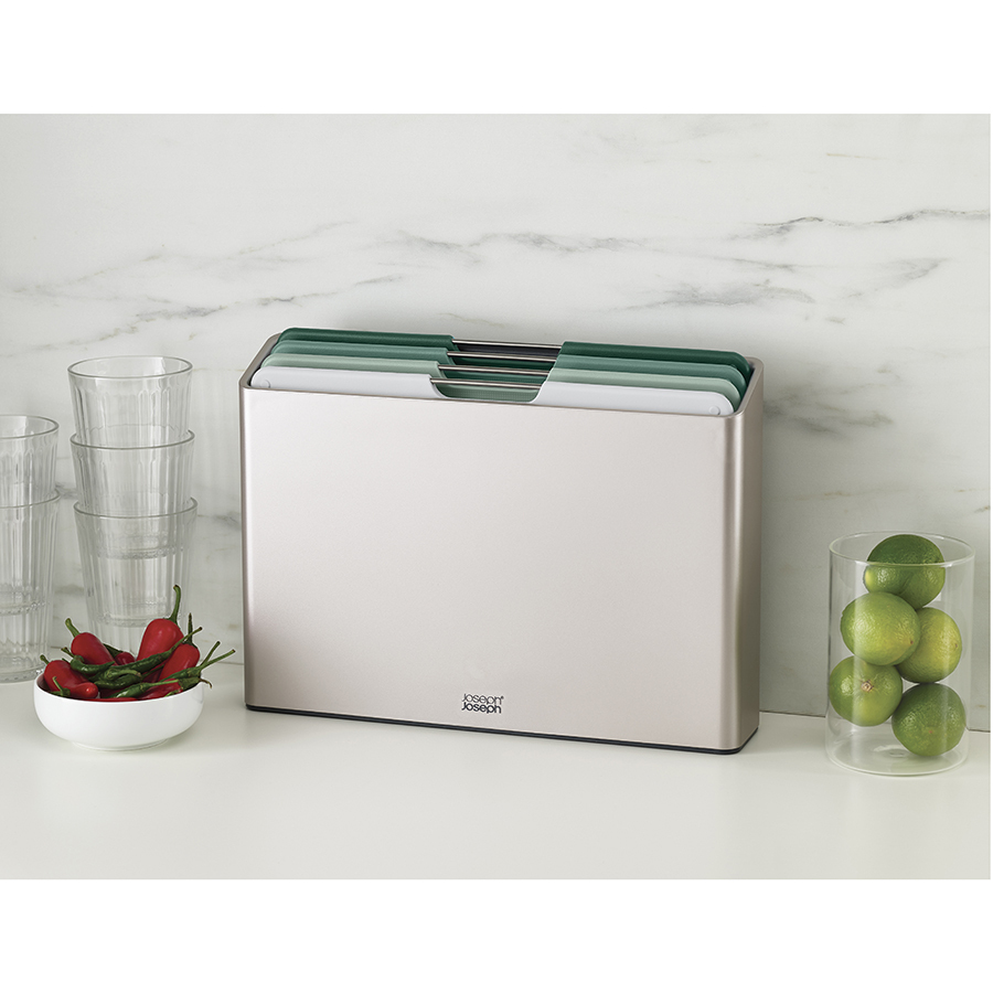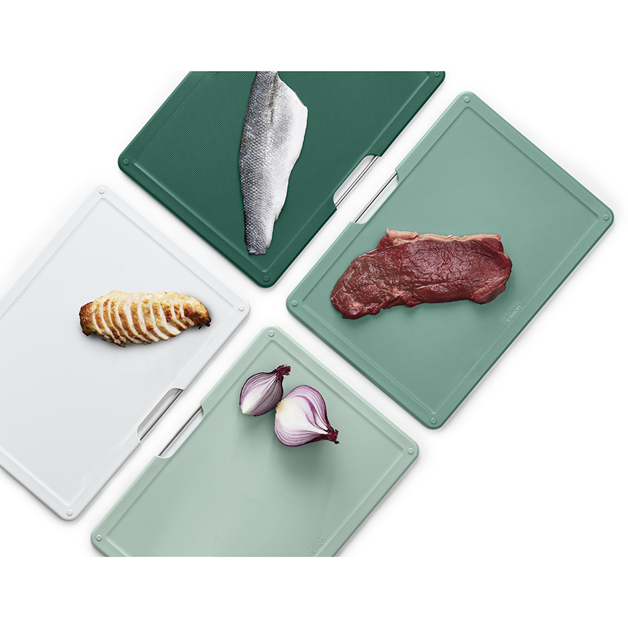 В комплект входит 4 цветных аксессуара с закругленными углами и нескользящими ножками. Небольшие края по контуру удерживают сок и крошки нарезаемых продуктов. При создании изделий мастера используют высококачественный пластик, который не затупляет ножи и при резке не оставляет микроскопических частиц на пище. На текстурированной поверхности досок не заметны царапины. Простая и вместе с тем эффективная цветная кодировка позволяет легко распределять доски для разных типов продуктов, сохраняя максимальную гигиену в процессе нарезки и исключая взаимное загрязнение продуктов. Эргономичная ручка в виде прутика из нержавеющей стали дает возможность легко брать аксессуар во время готовки. Пластиковый кейс для хранения занимает мало места и вписывается в любой интерьер кухни. Подставка удерживает аксессуары на расстоянии, позволяя воздуху равномерно циркулировать между ними.