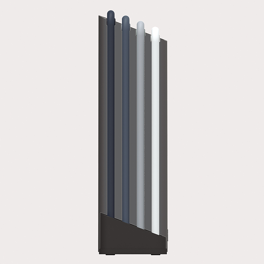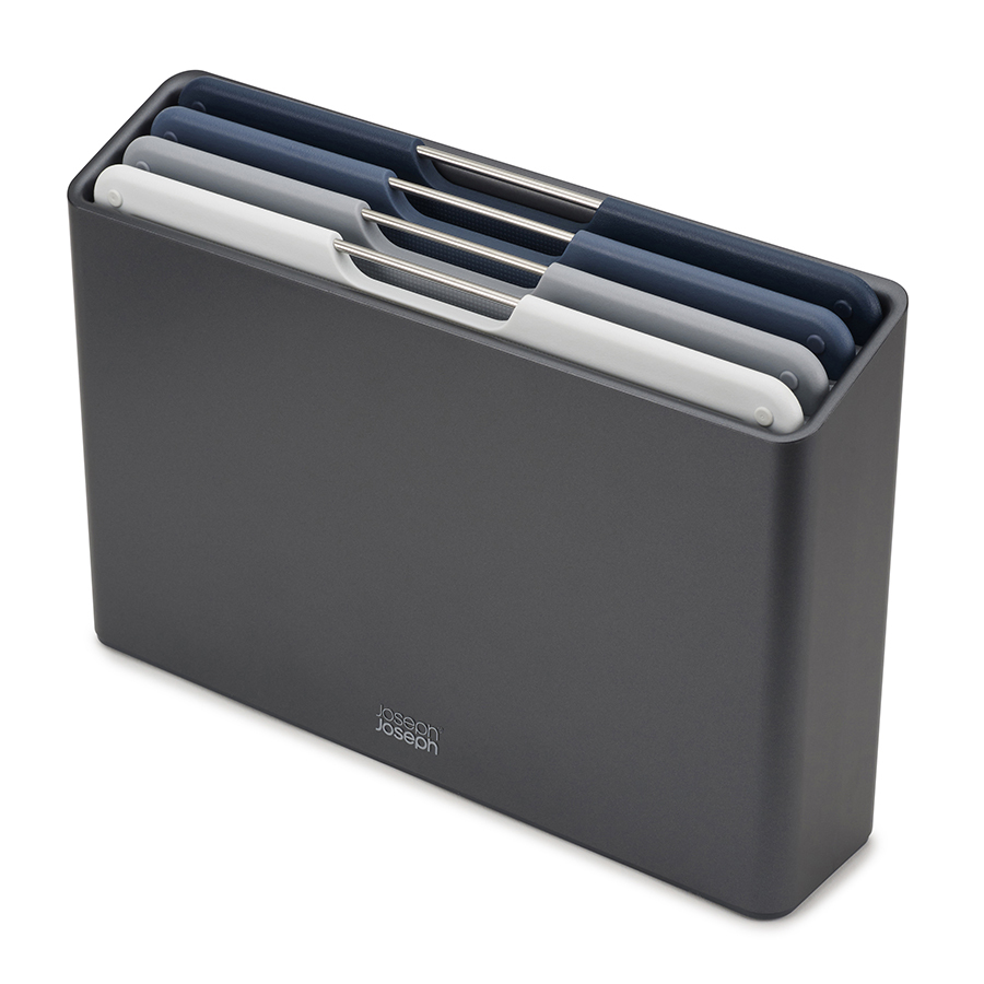 В комплект входит 4 цветных аксессуара с закругленными углами и нескользящими ножками. Небольшие края по контуру удерживают сок и крошки нарезаемых продуктов. При создании изделий используется высококачественный пластик, который не затупляет ножи и не оставляет микроскопических частиц на пище. На текстурированной поверхности досок не заметны царапины. Эффективная котировка позволяет легко распределять доски для разных типов продуктов, сохраняя максимальную гигиену в процессе нарезки. Эргономичная ручка в виде прутика из нержавеющей стали дает возможность легко доставать аксессуар во время готовки. Пластиковый кейс для хранения занимает мало места и вписывается в любой интерьер кухни. Подставка удерживает аксессуары на расстоянии, позволяя воздуху равномерно циркулировать между ними.