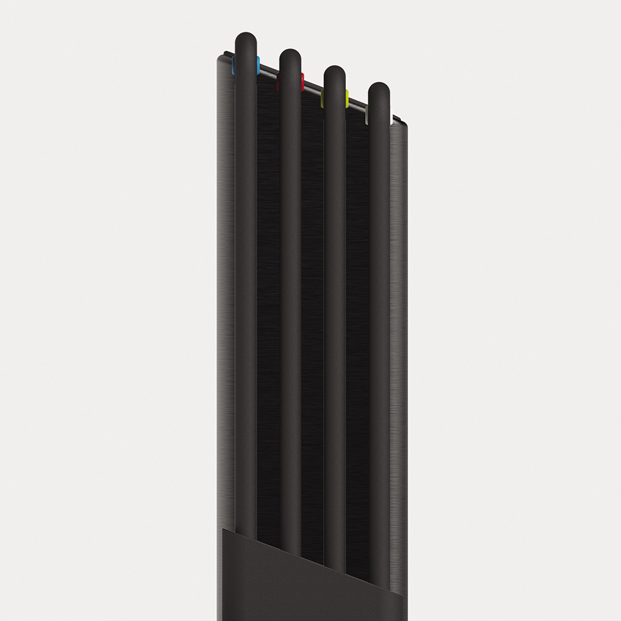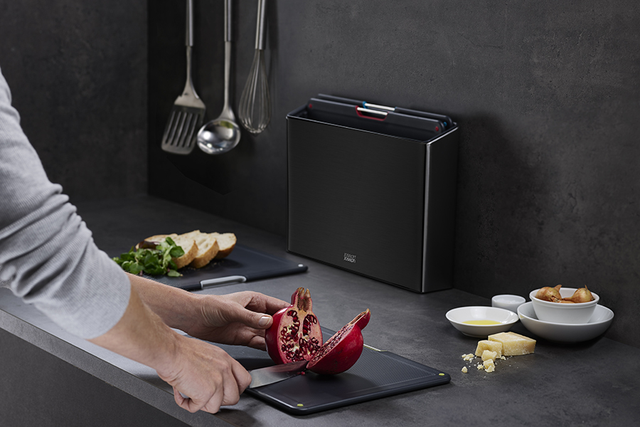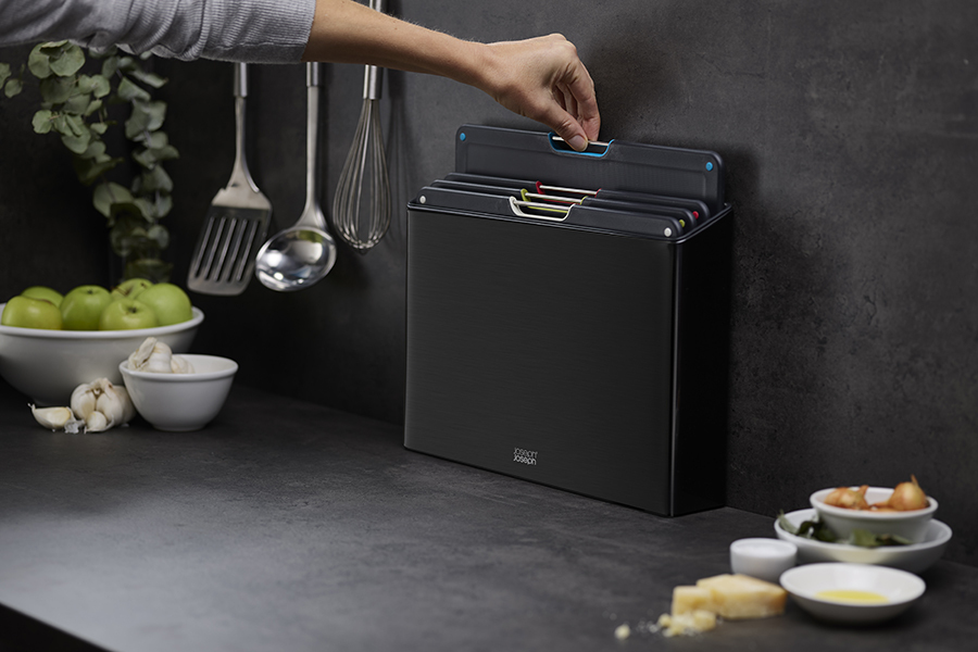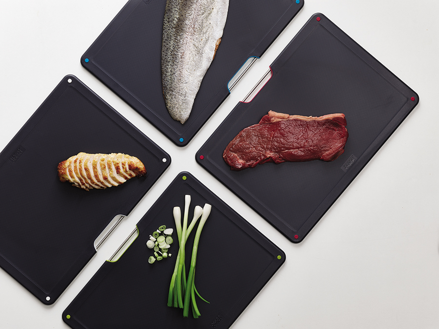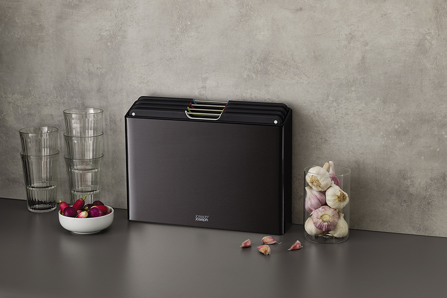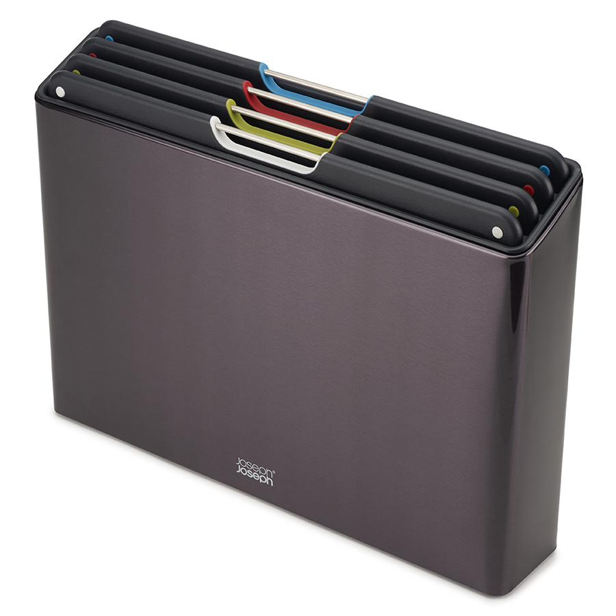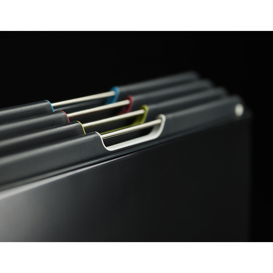 В комплект входит 4 черные доски с закругленными углами и нескользящими ножками. Небольшие края по контуру удерживают сок и крошки нарезаемых продуктов. При создании изделий мастера используют высококачественный пластик, который не затупляет ножи и при резке не оставляет микроскопических частиц на пище. На текстурированной поверхности досок не заметны царапины. Простая и вместе с тем эффективная цветная кодировка позволяет легко распределять доски для разных типов продуктов, сохраняя максимальную гигиену в процессе нарезки и исключая взаимное загрязнение продуктов. Эргономичная ручка в виде металлического прутика дает возможность легко брать аксессуар во время готовки. Подставка для хранения удерживает аксессуары на расстоянии, позволяя воздуху равномерно циркулировать между ними.