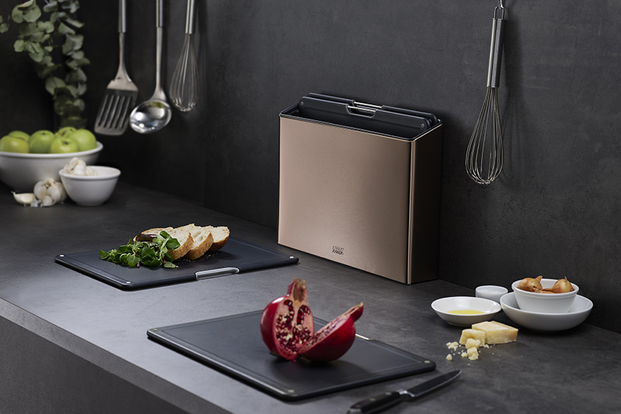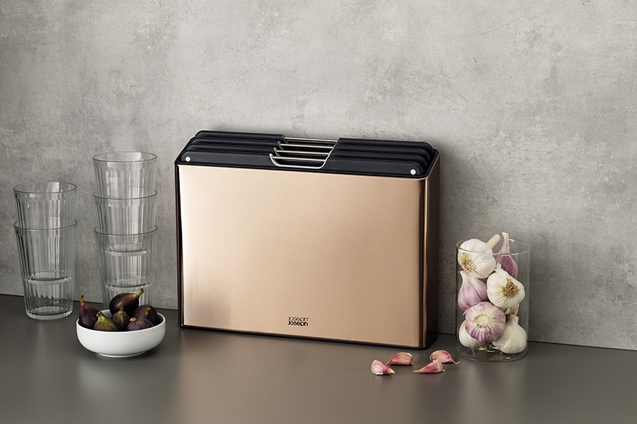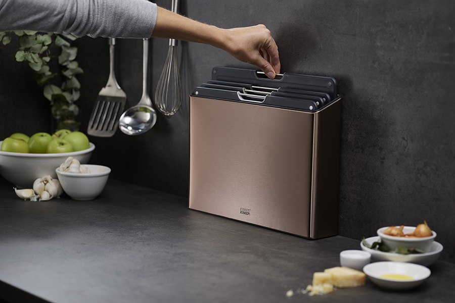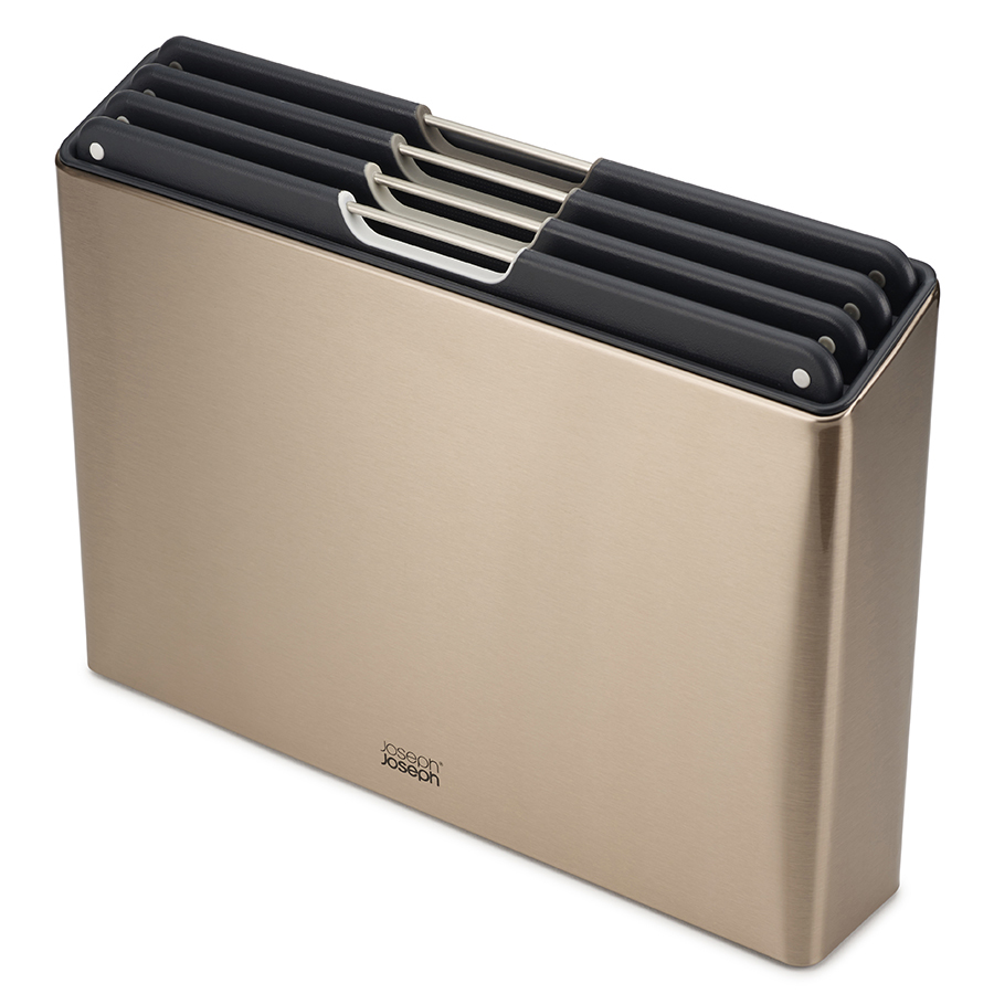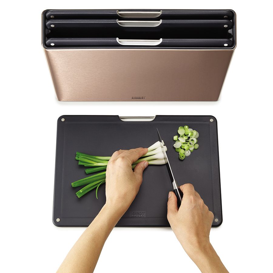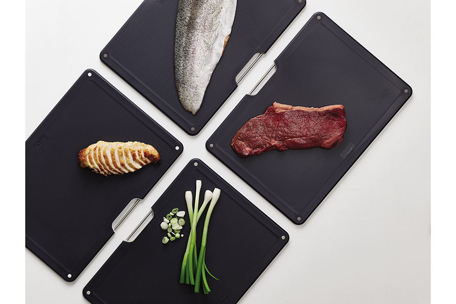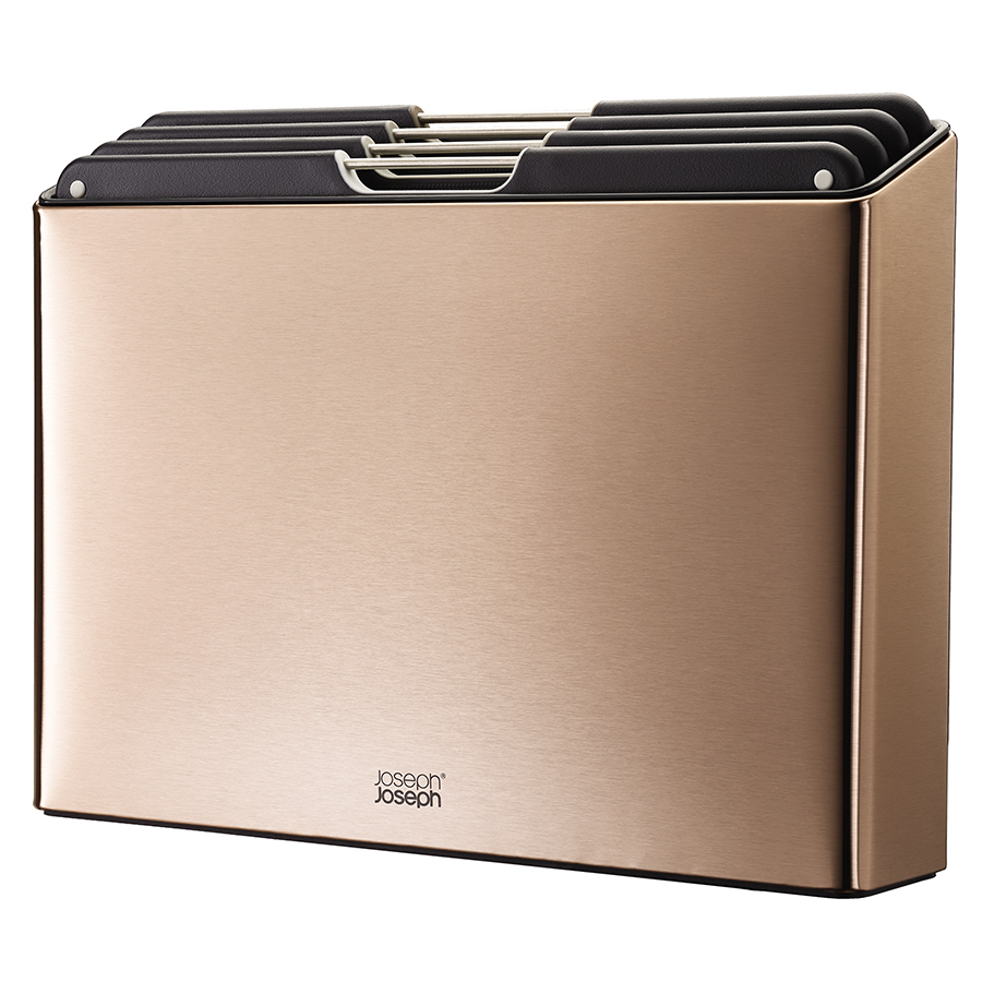 В комплект входит 4 черные доски с закругленными углами и нескользящими ножками. Небольшие края по контуру удерживают сок и крошки нарезаемых продуктов. При создании изделий мастера используют высококачественный пластик, который не затупляет ножи и при резке не оставляет микроскопических частиц на пище. На текстурированной поверхности досок не заметны царапины. Простая и вместе с тем эффективная цветная кодировка позволяет легко распределять доски для разных типов продуктов, сохраняя максимальную гигиену в процессе нарезки и исключая взаимное загрязнение продуктов. Эргономичная ручка в виде металлического прутика дает возможность легко брать аксессуар во время готовки. Подставка для хранения удерживает аксессуары на расстоянии, позволяя воздуху равномерно циркулировать между ними.