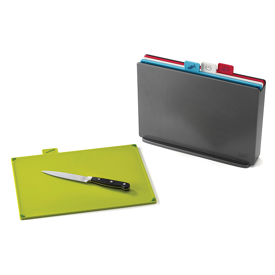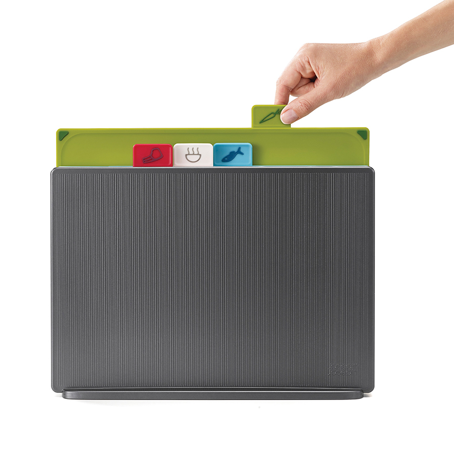 Теперь все доски в наборе с одинаковой плоской поверхностью и закругленными краями, удерживающими сок и крошки. Благодаря обновленной форме кейса набор занимает еще меньше места и вписывается в современные интерьеры кухонь. Простая и вместе с тем эффективная маркировка позволяет легко распределять доски для разных типов продуктов, сохраняя максимальную гигиену в процессе нарезки и исключая взаимное загрязнение продуктов. Специальные ярлыки помогают определить какую доску следует использовать для разных ингредиентов: сырого мяса, овощей, рыбы или же хлеба. Силиконовые ножки на досках препятствуют скольжению. Инновационное покрытие досок не дает ножам затупиться.