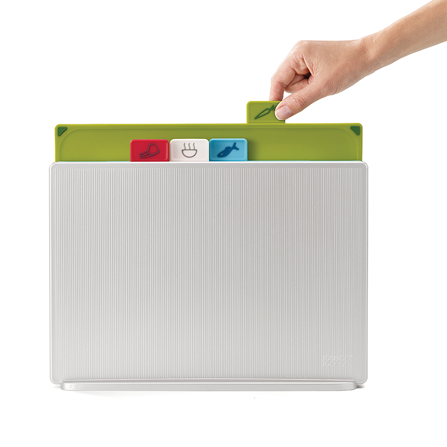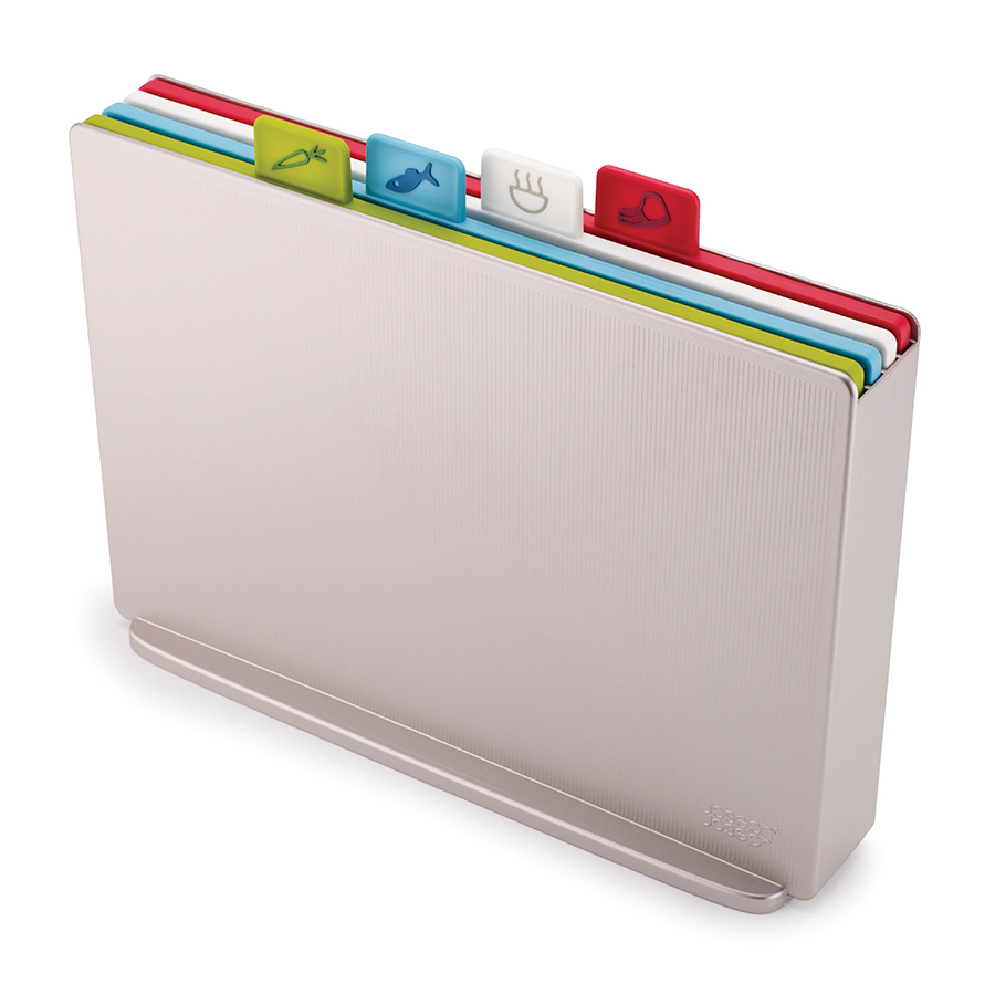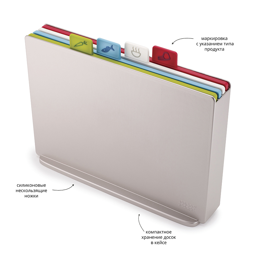 Теперь все доски в наборе с одинаковой плоской поверхностью и закругленными краями, удерживающими сок и крошки. Благодаря обновленной форме кейса набор занимает еще меньше места и вписывается в современные интерьеры кухонь. Простая и вместе с тем эффективная маркировка позволяет легко распределять доски для разных типов продуктов, сохраняя максимальную гигиену в процессе нарезки и исключая взаимное загрязнение продуктов. Специальные ярлыки помогают определить какую доску следует использовать для разных ингредиентов: сырого мяса, овощей, рыбы или же хлеба. Силиконовые ножки на досках препятствуют скольжению. Инновационное покрытие досок не дает ножам затупиться.
